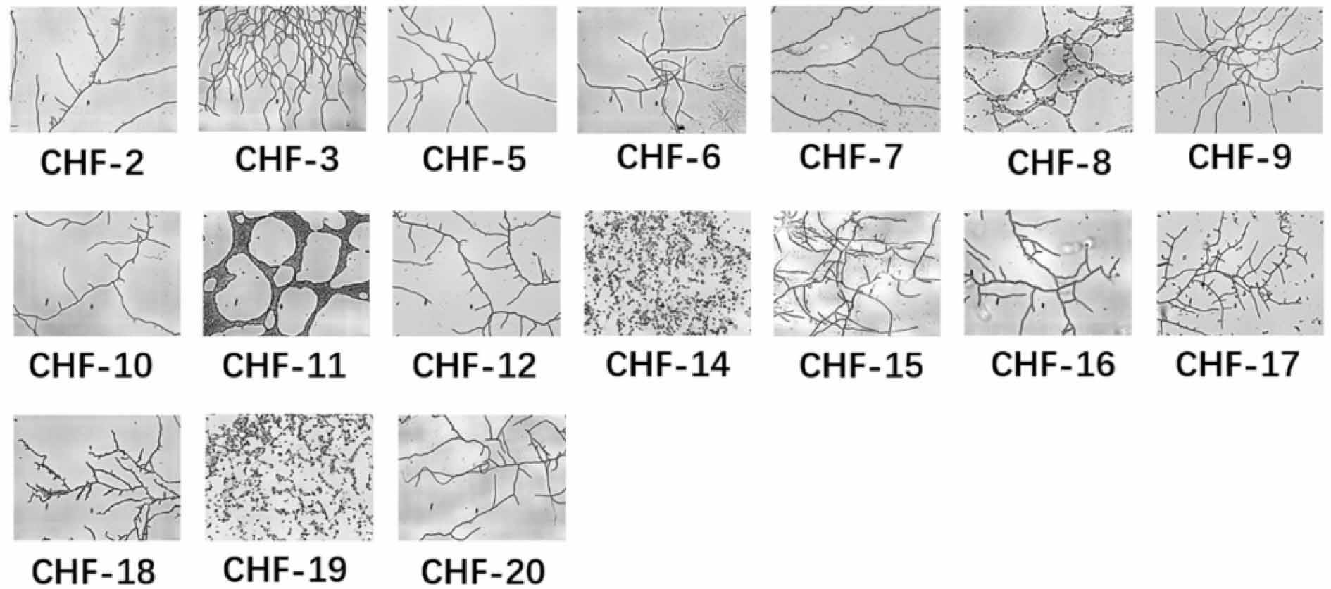 Seventeen distinct strains were isolated from lichen samples collected at the base of the Helan Mountains, and their identities were subsequently confirmed. The morphologies of these colonies are illustrated in Fig. 1. The majority of the colonies were small and dense, with a relatively dry surface that adhered tightly to the growth medium, making them difficult to manipulate with an inoculating loop. In contrast, a few strains displayed a moist, smooth surface, which facilitated easy picking. The metabolites produced by these strains exhibited variations in color and shape, with subtle differences observed between the front and back sides of the colonies. Imaging was conducted using a 10 × 40 biological optical microscope, as shown in Fig. 2. Most strains exhibited well-developed mycelium, characterized by branched, filamentous structures. However, a few strains exhibited different growth patterns: strains CHF-8 and CHF-11 formed reticular (net-like) structures; CHF-14 and CHF-19 developed nearly spherical colonies, which appeared either singly or in pairs; and CHF-17 displayed dense branching with an abundance of sporangia.