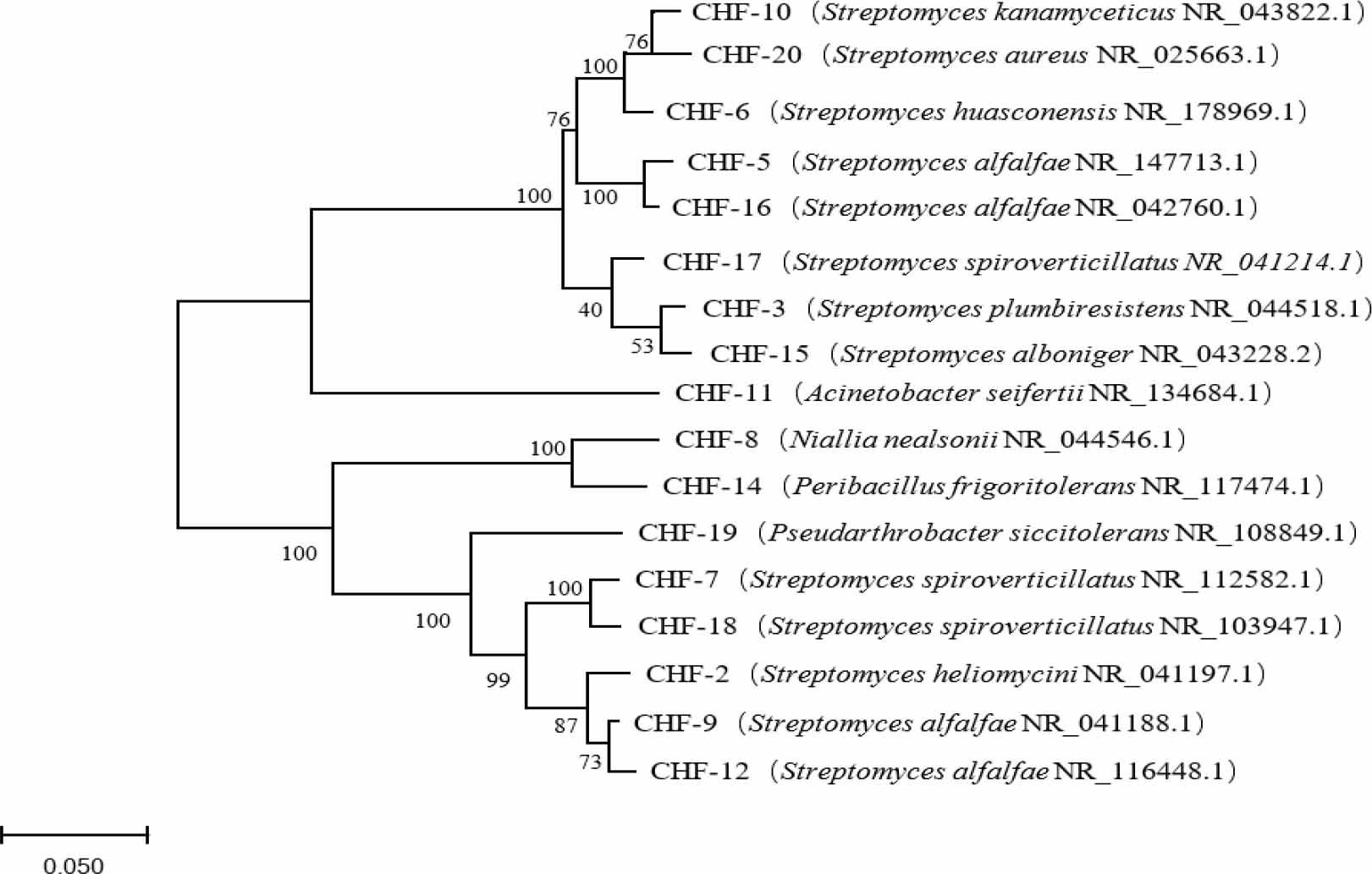 The 16S rRNA gene sequences of the strains were determined and compared with reference sequences in the NCBI database to identify the species with the highest similarity (Table IV). It is widely accepted that a 16S rRNA gene sequence similarity of over 97% indicates that the strains belong to the same species. The results showed that all 17 strains had 16S rRNA gene sequences that were 97% or more similar to their respective reference sequences. Based on these comparisons, the strains were classified into five genera: 13 strains of Streptomyces, 1 strain of Niallia, 1 strain of Acinetobacter, 1 strain of Peribacillus, and 1 strain of Pseudoclavibacter. A phylogenetic tree was constructed using the Neighbor-Joining (NJ) method to illustrate the evolutionary relationships among the strains. The optimal tree with the sum of branch length = 4.67325812 is shown (Fig. 3). The percentage of replicate trees in which the associated taxa clustered together in the bootstrap test (1,000 replicates) is shown next to the branches. The evolutionary distances were computed using the p-distance method and are expressed as the number of base differences per site. The analysis involved 17 nucleotide sequences. All positions with less than 50% site coverage were eliminated. That is, fewer than 50% alignment gaps, missing data, and ambiguous bases were allowed at any position. There were a total of 1398 positions in the final dataset. The bootstrap values at the nodes indicate the confidence levels of the phylogenetic groupings, with higher values suggesting closer evolutionary relationships. Further analysis of the phylogenetic tree revealed the following relationships: Streptomyces strains CHF-6 and CHF-20, CHF-5 and CHF-16, and CHF-7 and CHF-18 had bootstrap values of 100%, indicating very close evolutionary relationships. Strains CHF-8 and CHF-14 exhibited a high degree of relatedness, as did strains CHF-9, CHF-12, and CHF-2. These findings provide valuable insights into the phylogenetic relationships of the isolated strains and their potential taxonomic classifications.
