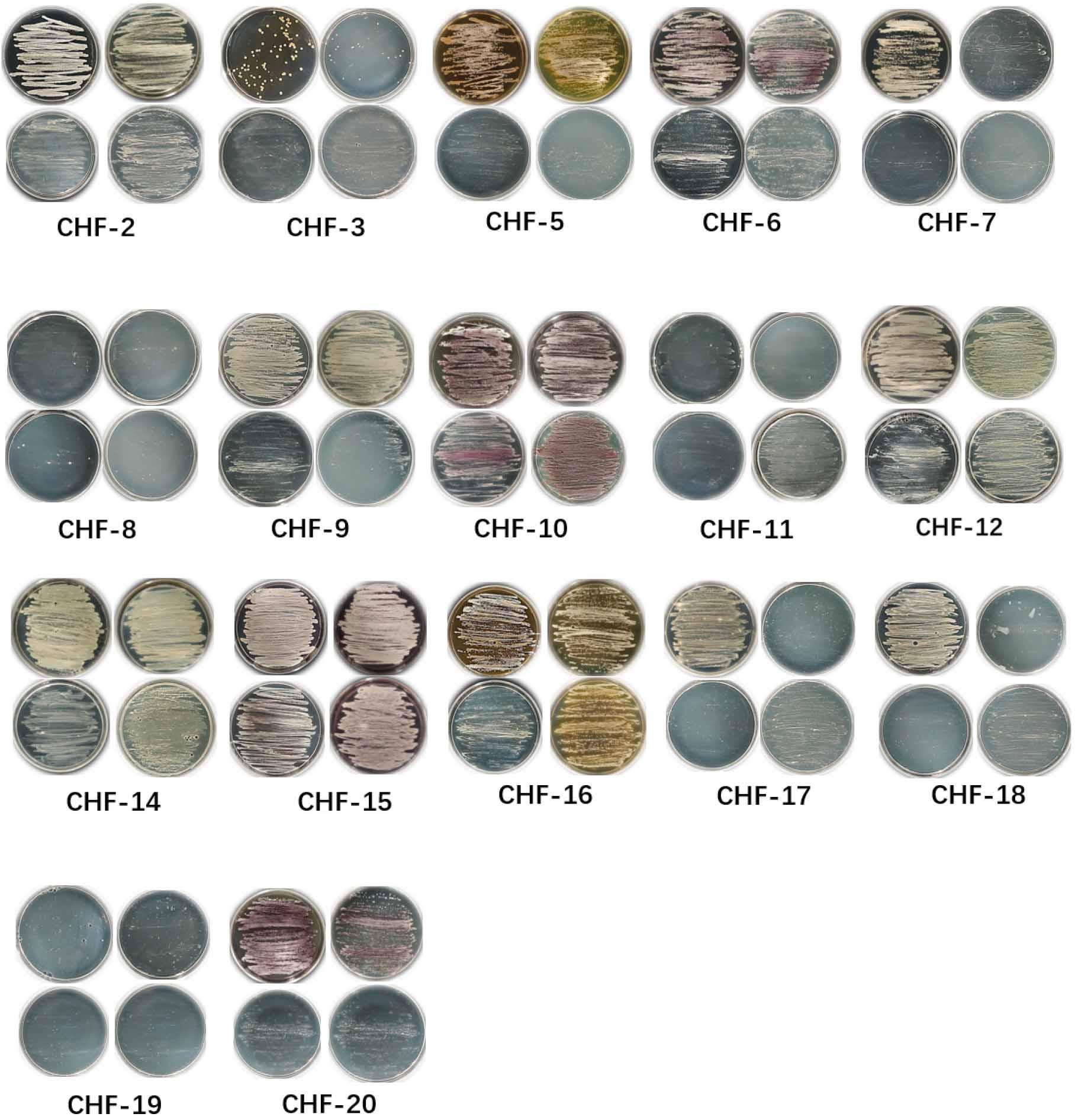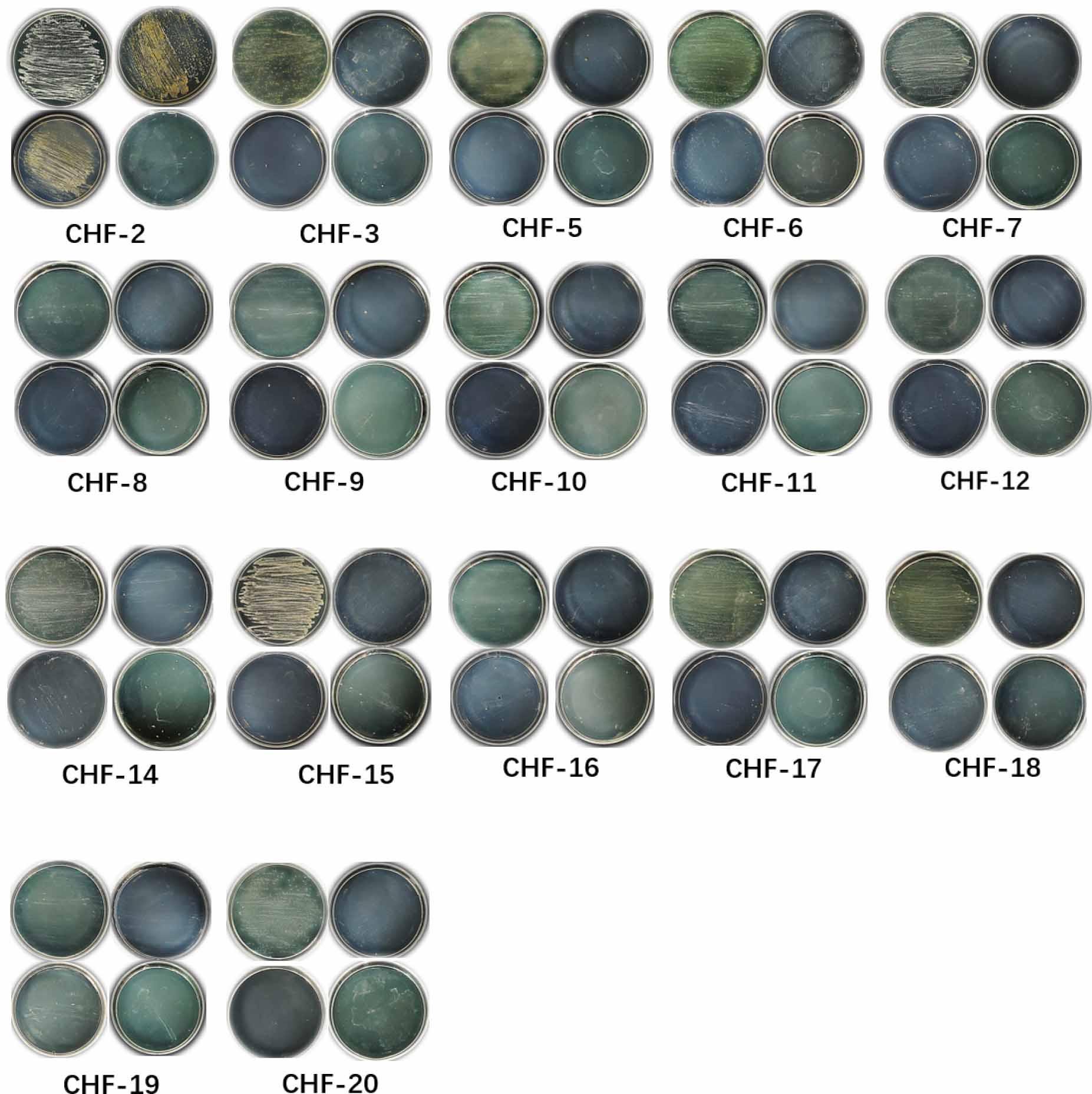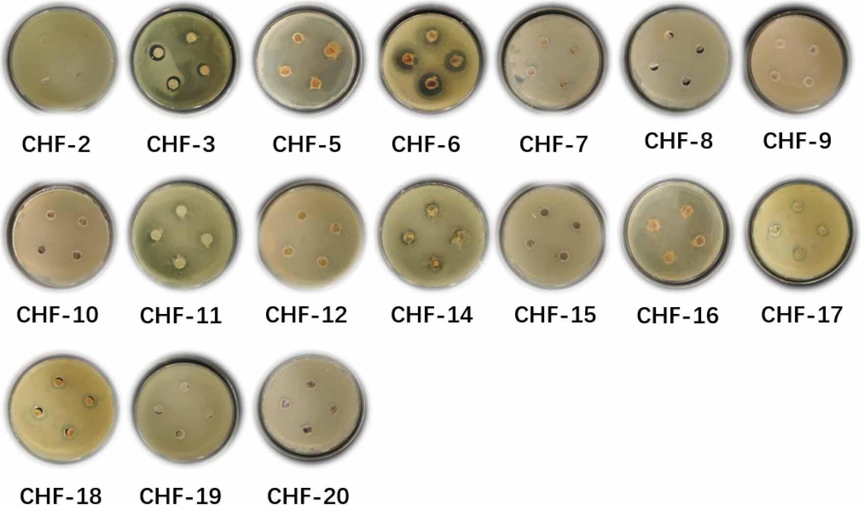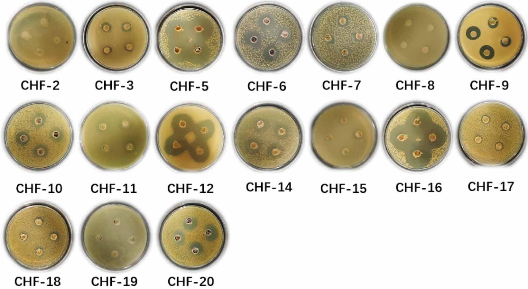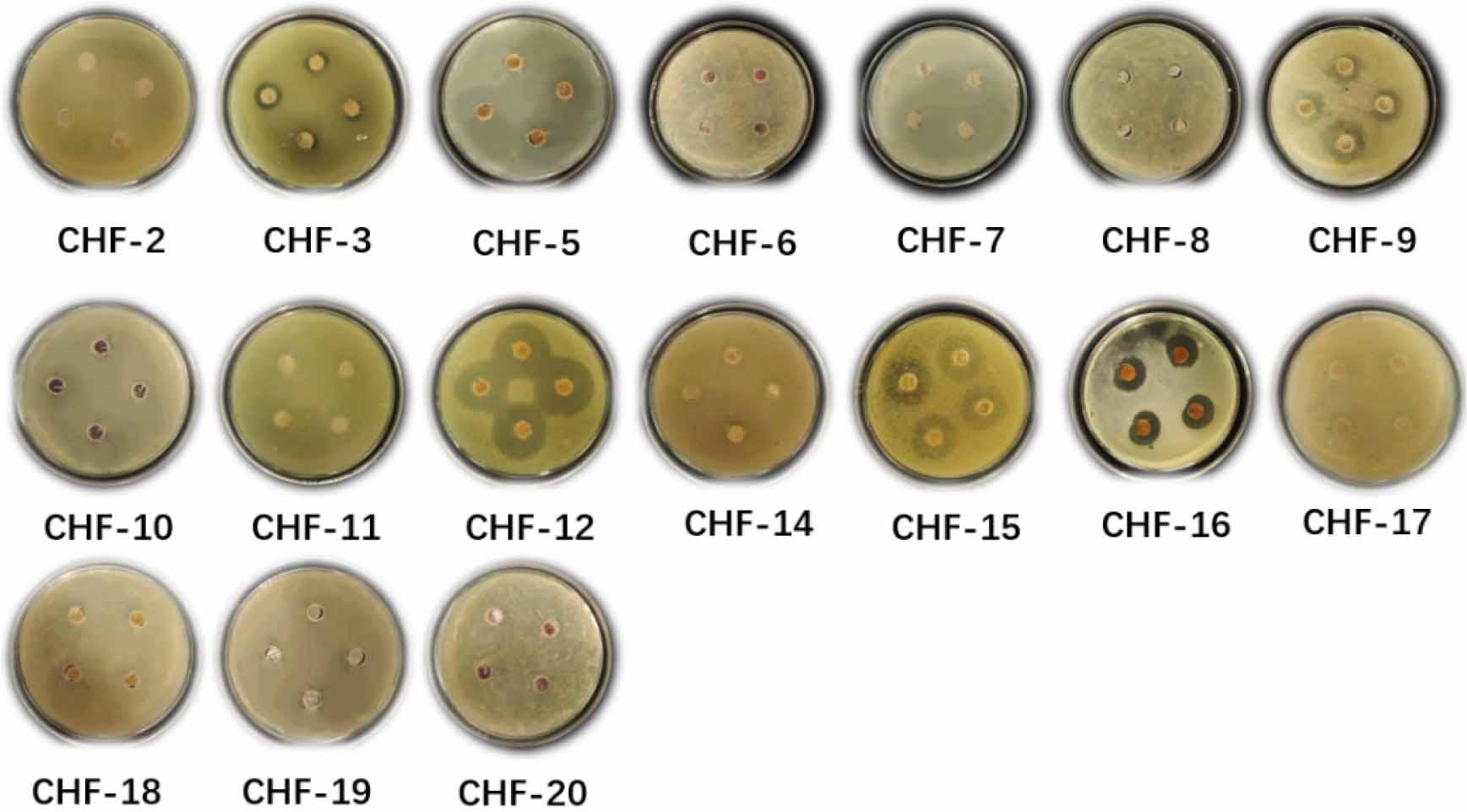 The antimicrobial activity of 17 bacterial strains against three indicator strains was assessed using the agar plug colonization method. The results indicated that most strains exhibited distinct inhibition zones. In the assay against S. aureus, inhibition zones were precisely measured for 14 strains: CHF-3 (1.52 cm), CHF-5 (4.25 cm), CHF-6 (2.27 cm), CHF-7 (1.49 cm), CHF-9 (1.78 cm), CHF-10 (2.11 cm), CHF-11 (1.62 cm), CHF-12 (3.34 cm), CHF-14 (2.14 cm), CHF-15 (1.20 cm), CHF-16 (4.14 cm), CHF-17 (1.49 cm), CHF-18 (1.47 cm), and CHF-20 (2.20 cm). These findings suggest that the secondary metabolites of these strains possess antimicrobial activity against S. aureus. Notably, strains CHF-5, CHF-12, and CHF-16 exhibited significant inhibitory effects under the experimental conditions, with inhibition zone diameters exceeding 3 cm.
