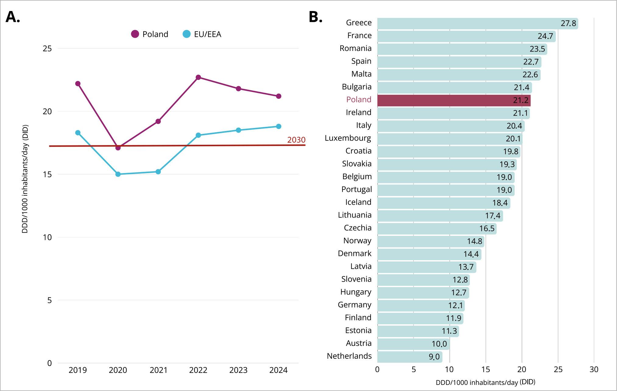 Community consumption of systemic antibacterials (ATC J01) in Poland compared with the EU/EEA average over time, and the 2030 target for Poland (A) and overall antibacterial use in the EU/EEA in 2024 (B).