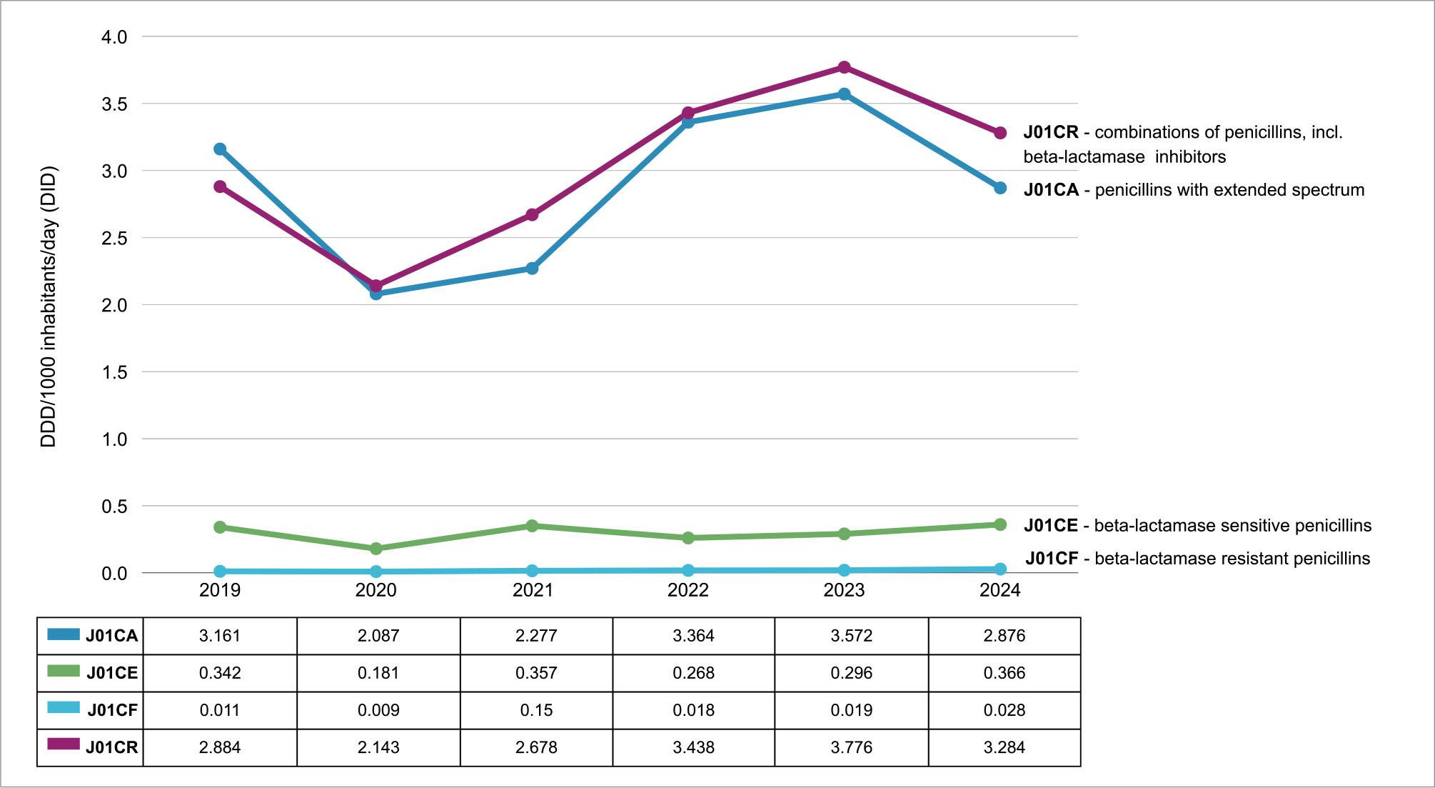 Across the analyzed ATC J01 subgroups, beta-lactam antibacterials – penicillins (J01C) consistently represented the largest share of outpatient antibiotic consumption in Poland during 2019–2024. In 2019, their use amounted to approximately 6.40 DID, representing about 29% of total antibacterial consumption. A sharp decline was observed in 2020, down to 4.42 DID, reflecting the immediate impact of the COVID-19 pandemic. A gradual increase followed, with penicillins use rising to 7.09 DID in 2022, peaking at 7.66 DID in 2023, and slightly declining to 6.55 DID in 2024, representing approximately 31% of total community consumption (Fig. 2). Within J01C subgroup, in 2019 (before the pandemic), extended-spectrum penicillins (J01CA) were predominant within the J01C subgroup; however, since 2021, a gradual shift has been observed toward increased use of penicillin combinations with beta-lactamase inhibitors (Fig. 3).