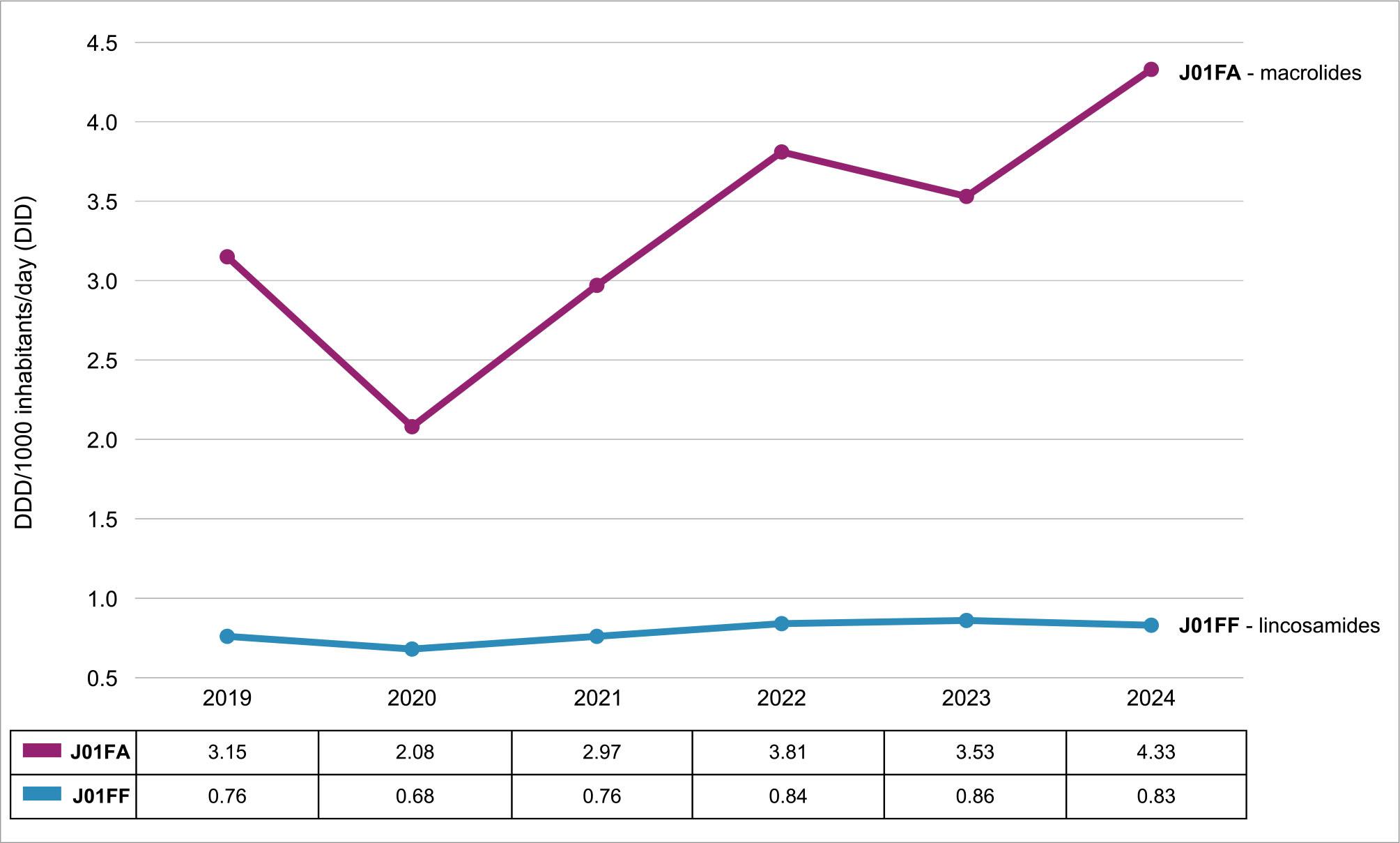 A similar dynamic was observed for macrolides, lincosamides, and streptogramins (J01F). In 2019, their combined consumption was 3.91 DID (18% of total use). This value declined by more than half in 2020 (2.76 DID), followed by a gradual recovery: by 2021, usage had returned to pre-pandemic level (3.73 DID), and by 2024 it reached 5.17 DID, accounting for approximately 24% of overall community antibiotic consumption (Fig. 2). This represents a marked increase in the relative share of J01F antibiotics between 2019 and 2024, indicating an upward trend in the use of macrolides and related agents in outpatient settings. The observed rise in macrolide consumption in Poland after 2020 corresponds with post-pandemic increases reported in other European countries, particularly in southern and central Europe, where azithromycin (J01FA01) and clarithromycin (J01FA09) use returned to or exceeded pre-COVID levels (Kostev et al. 2025). This may reflect renewed circulation of respiratory pathogens and a return to pre-pandemic prescribing behaviors. In Poland in 2024, azithromycin (2.33 DID) and clarithromycin (1.97 DID) ranked fifth and sixth, respectively, in outpatient consumption among all systemic antibacterials (ATC J01) (Table I). The marked increase in macrolide use, particularly clarithromycin (J01FA09, Watch group), coincided with a sharp rise in pertussis incidence. According to the National Institute of Public Health - National Institute of Hygiene (NIPH-NIH), 32.430 cases of pertussis were reported in Poland in 2024, compared with only 922 in 2023, representing nearly a 35-fold increase (Wojtyniak and Smaga 2025). As macrolides remain the first-line drugs in pertussis treatment, this changed epidemiological situation likely contributed to the overall rise in macrolide consumption and reflects the broader post-pandemic resurgence of bacterial respiratory infections. Between 2019 and 2024, the consumptionof lincosamides remained stable, in contrast to that of macrolides (Fig. 4).