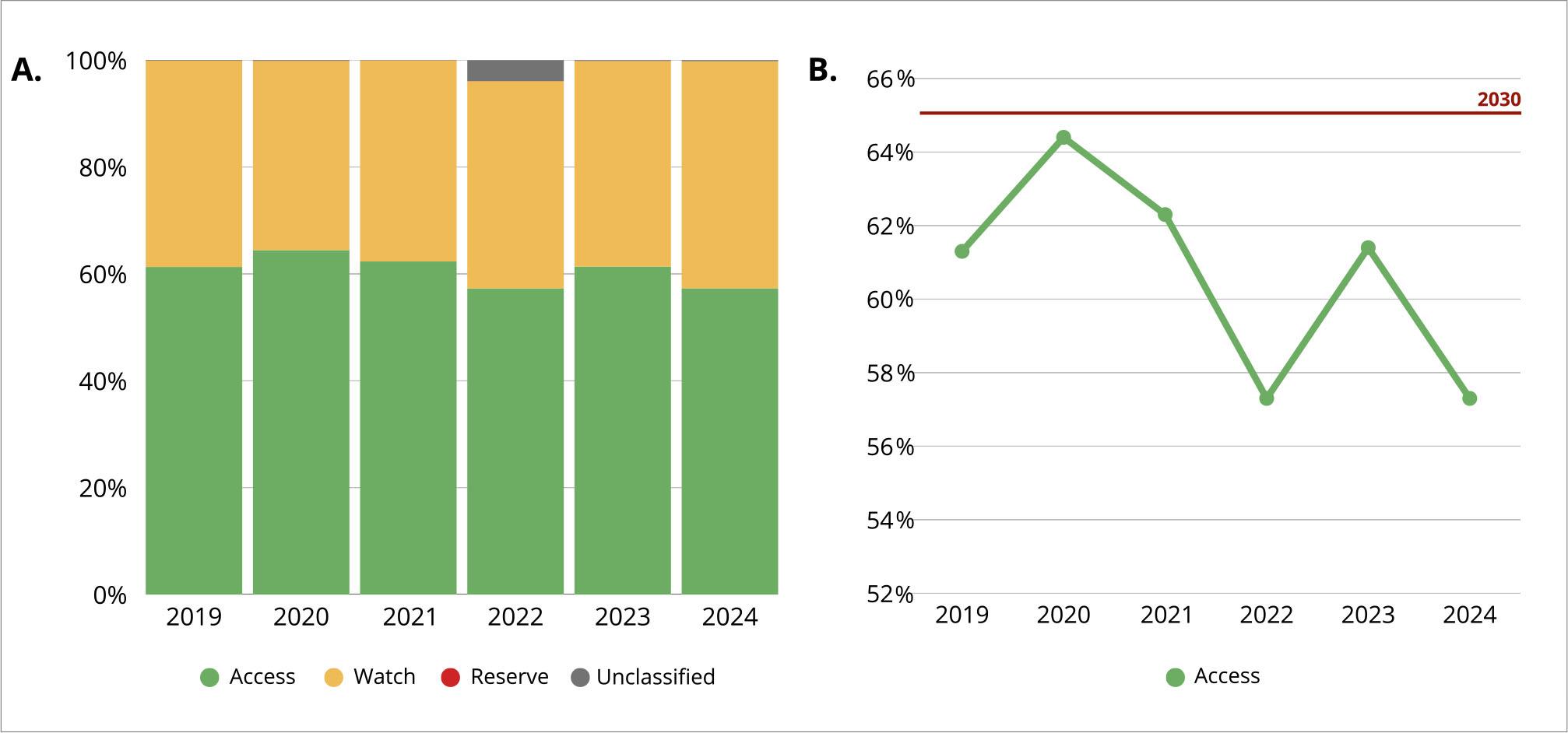 Community antibiotic consumption in Poland according to the WHO AWaRe classification (2019–2024). A. Distribution of antibiotic consumption by AWaRe categories in the community sector; B. Temporal trend in the percentage of Access group antibiotics in total community consumption, with the 2030 EU target (≥65%) indicated by the reference line.