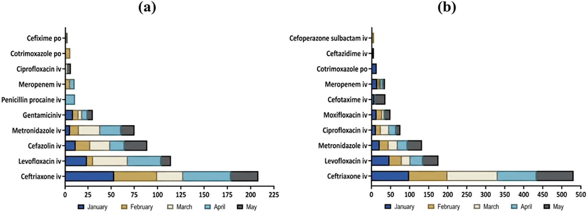 Trend of top ten antibiotics consumed in January–May 2019 (DDD/100-BD) in (a) surgical wards and (b) medical wards.