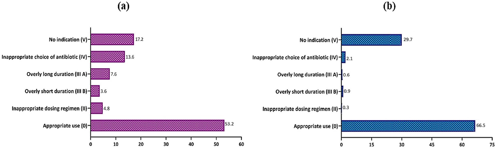 Quality of antibiotic use (% Gyssens category) in (a) surgical wards and (b) medical wards.