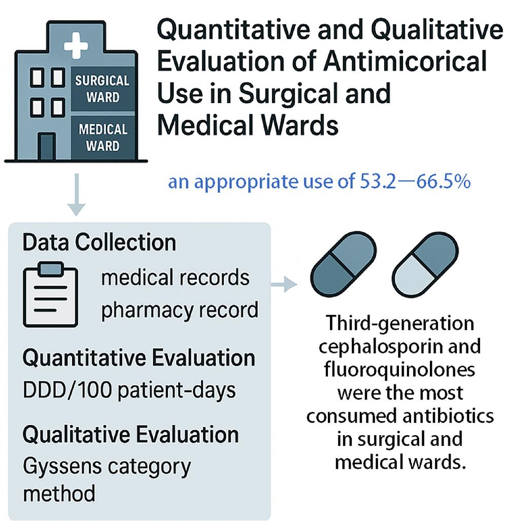 In conclusion, third-generation cephalosporins and fluoroquinolones are the most commonly used antibiotics in surgical and medical wards. The quality of antibiotic use showed that appropriate use accounted for 53.2–66.5% of total antibiotic use in medical and surgical wards. Establishing an antimicrobial stewardship program would help control antibiotic consumption and optimize antibiotic use in hospitals.