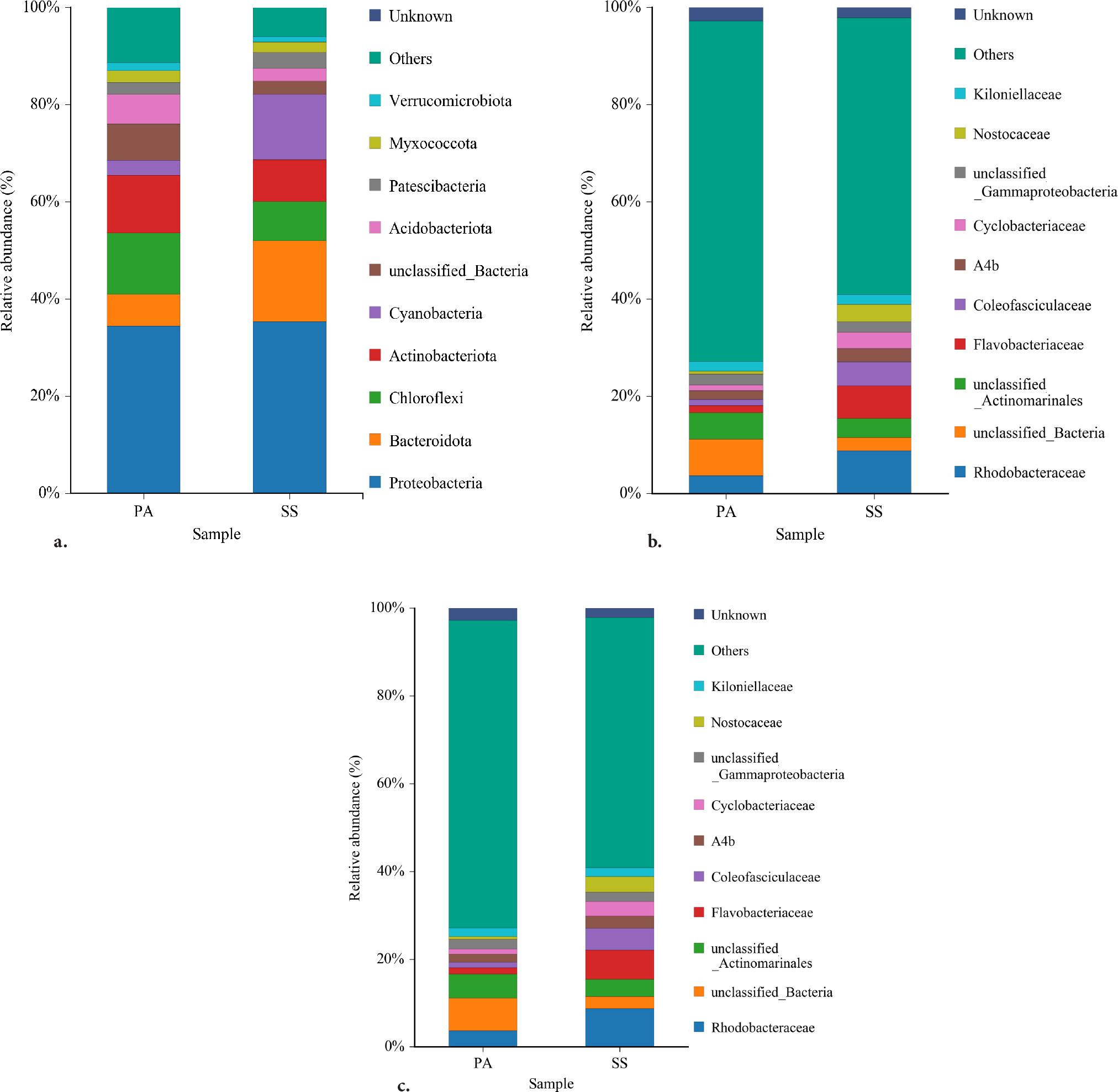 Based on species annotation and taxonomic analysis, bar charts of species classification were generated for the top 10 most abundant bacterial species in the rhizosphere soil of common reed and common seepweed. At the phylum level, the dominant bacteria in the PA group are Proteobacteria, Bacteroidota, Chloroflexota, Actinomycetota, and Acidobacteriota. In the SS group, the dominant bacteria are Proteobacteria, Bacteroidota, Chloroflexota, Actinomycetota, and Cyanobacteria. At the family level, two dominant bacterial families (relative abundance > 1%) were identified in both groups: unclassified_Coleofasciculaceae: The relative abundance was 1.05% in the PA group and 3.38% in the SS group, showing a significantly higher abundance in the common seepweed rhizosphere. unclassified_Unknown_Family: The relative abundance was 2.48% in the PA group and 1.75% in the SS group, with a higher abundance in the common reed rhizosphere. At the genus level, aside from unclassified species, the dominant genus in both common reed and common seepweed rhizosphere is Zeaxanthinibacter, with relative abundances of 0.60% in the PA group and 2.49% in the SS group. Other major unclassified genera include unclassified_Bacteria: 7.50% (PA group) and 2.72% (SS group), unclassified_Actinomarinales: 4.61% (PA group) and 3.16% (SS group), unclassified_Gammaproteobacteria: 2.44% (PA group) and 2.39% (SS group).
