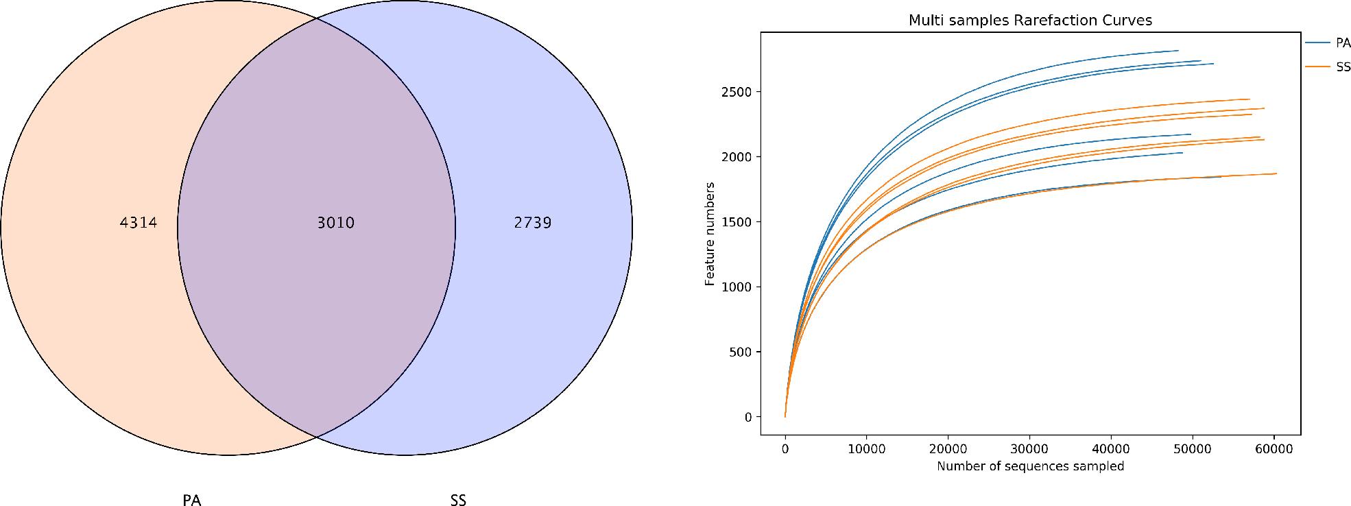 In this study, a total of 10,063 bacterial ASVs were obtained across sample groups. The PA group contained 4,314 unique ASVs (42.8%), while the SS group had 2,739 unique ASVs (27.2%). Both groups shared 3,010 ASVs. Rarefaction curves were generated to validate the adequacy of sequencing depth for capturing Bacterial diversity. Curve plateauing indicated sufficient sequence coverage, confirming the robustness of the data for downstream analyses. When the number of randomly selected sequences reaches 10,000, the curve gradually flattens, suggesting that the data are valid.