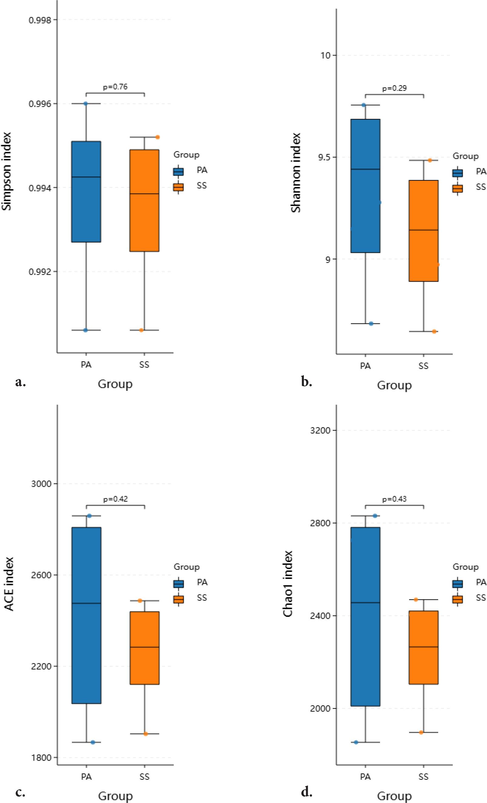 In bacterial community studies, alpha diversity indices are commonly used to characterize the species features of a community. Among these, the Shannon and Simpson indices primarily measure species diversity, while the Chao1 and ACE indices focus on assessing species richness within the community. The results indicated no significant differences in the Simpson index and Shannon index between the PA and SS groups (p > 0.05). Similarly, no significant differences were observed in the Chao1 and ACE indexes (p > 0.05). The SS groups exhibited a mild upward trend in key alpha diversity indices relative to the PA group: the Shannon index increased by 5.11% (from 8.41 to 8.84), the Simpson index increased by 0.51% (from 0.987 to 0.992), the Chao1 index increased by 10.20% (from 2027.83 to 2234.58), and the ACE index increased by 10.20% (from 2048.67 to 2257.42). The coverage of all samples was significantly greater than 0.99, indicating that all fragment sequences were detected and that the sequencing results accurately reflect the actual conditions.