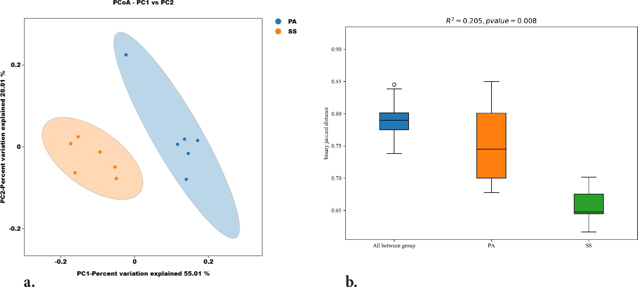 Principal Coordinates Analysis (PCoA) was employed to visualize similarities and dissimilarities among samples, providing an intuitive representation of divergence and convergence between distinct bacterial communities. Results demonstrated that PC1 and PC2 accounted for 55.01% and 20.01% of the total β-diversity variation, respectively, in the Weighted Unifrac-based PCoA. Robust separation along the PC1 axis between the PA group (P. australis) and SS group (S. salsa) was observed with a clear distribution pattern: the PA group exhibited positive PC1 values (mean: 0.1139, range: -0.0233 to 0.1706) while the SS group showed negative PC1 values (mean: -0.1139, range: -0.1730 to -0.0496), Statistical analysis further confirmed that the inter-group difference along PC1 was extremely significant (p = 0.0001), whereas no significant difference was detected along the PC2 axis (p = 0.2385). PERMANOVA analysis (distance metric: binary_jaccard; permutation method: permanova) further confirmed the statistical significance of inter-group differences. The calculated R2 value of 0.205 (representing the proportion of variance explained by grouping factors) with higher R2 values denoting greater separation significance. The statistically significant p-value (p = 0.008; p < 0.05) validated high analytical reliability.