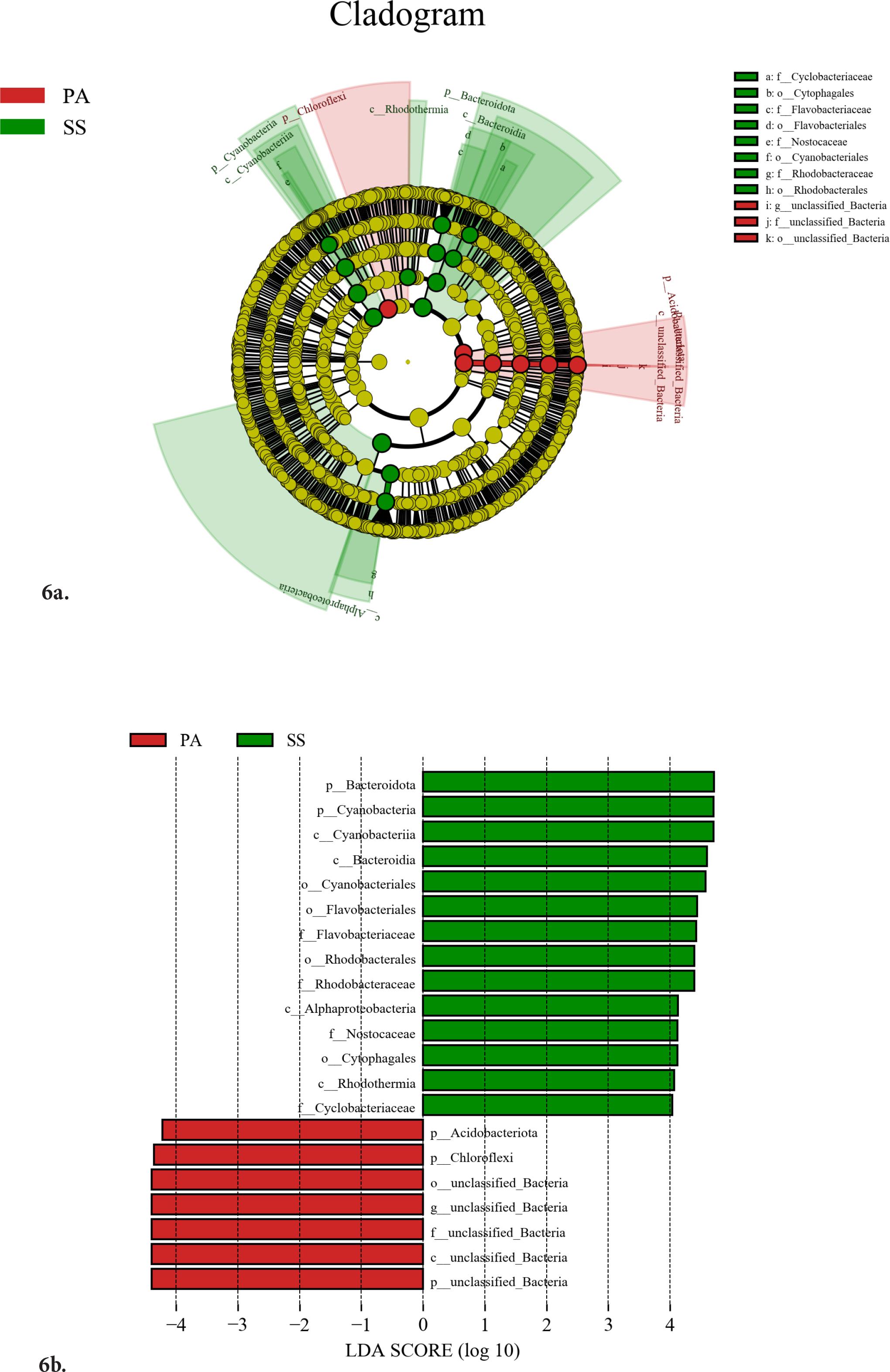 LEfSe analysis was primarily used to identify differentially expressed biomarkers that were significantly different between sample groups. Analysis of rhizosphere microbes in Common reed and Common seepweed (taxonomic levels: phylum to genus; LDA threshold = 4.0) revealed 21 significantly different taxa between the two plant species. Significant biomarkers, excluding unclassified bacteria, included the phyla Acidobacteriota and Chloroflexota in the reed rhizosphere. Biomarkers for Common seepweed comprised: Bacteroidota (phylum), Cyanobacteria (phylum), Cyanobacteria (class), Bacteroidia (class), Alphaproteobacteria (class), Rhodothermia (class), Cyanobacteriales (order), Flavobacteriales (order), Rhodobacterales (order), Cytophagales (order), Flavobacteriaceae (family), Rhodobacteraceae (family), Nostocaceae (family, corrected spelling), Cyclobacteriaceae (family).