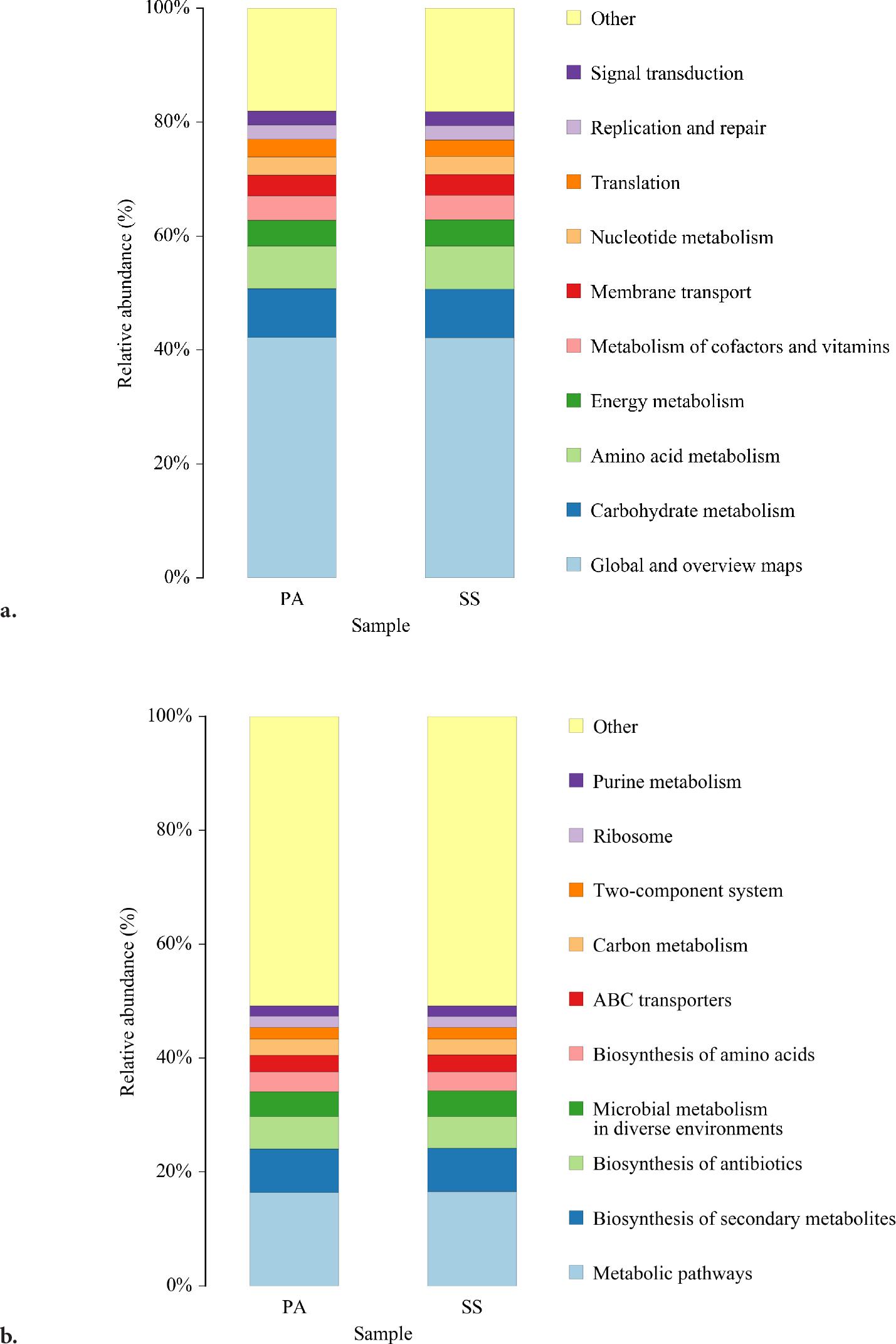 PICRUSt2 Analysis of Phragmites australis and Suaeda salsa at Different Functional Levels. a) KEGG Level 2 functional hierarchy; b) KEGG Level 3 functional hierarchy. The x-axis represents the sample groups, while the y-axis shows the relative abundance (%) of metabolic pathways.