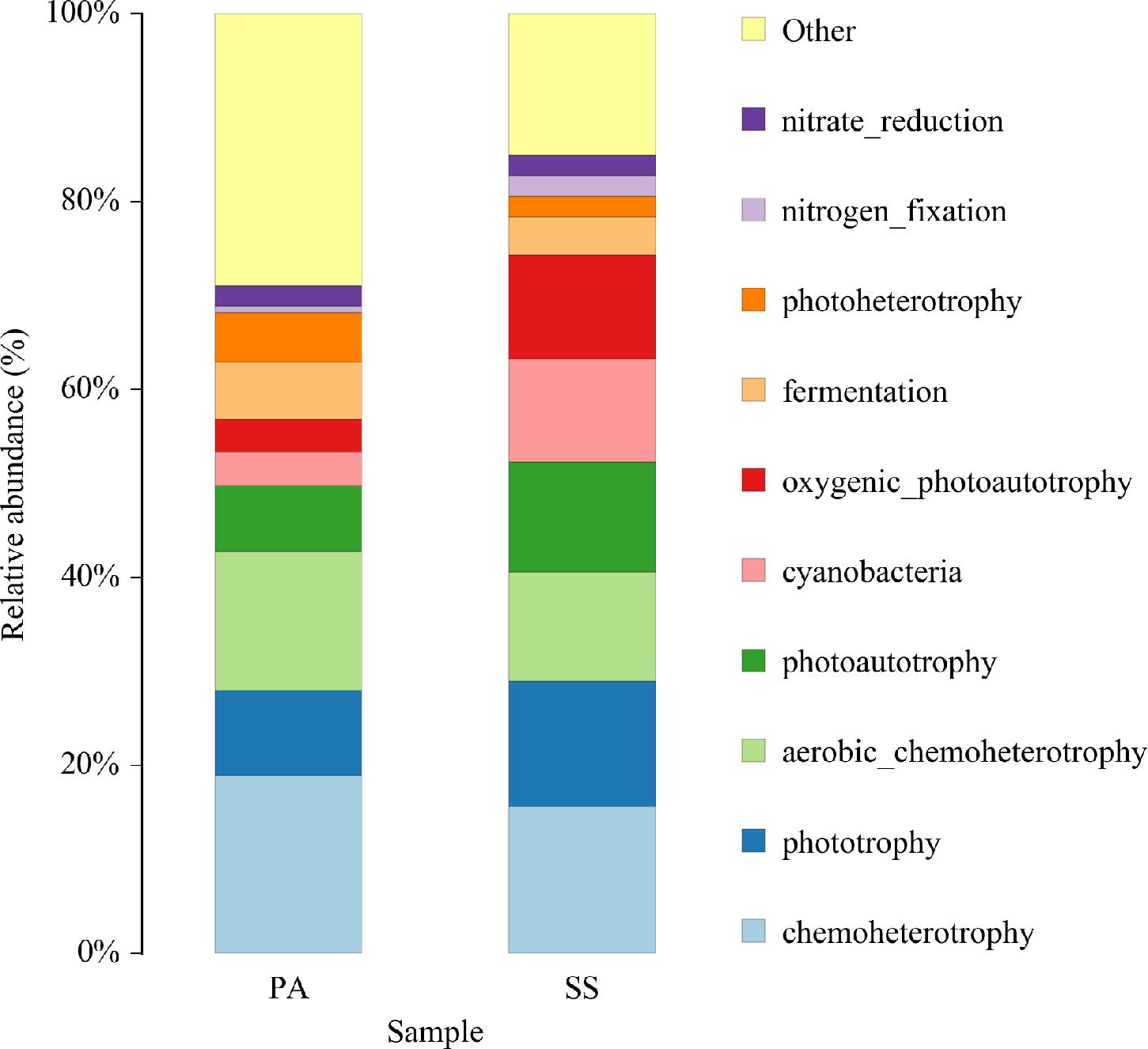 FAPROTAX analysis of the top 10 ecological functions in the rhizospheres of common reed and seepweed revealed shared functional profiles with divergent relative abundances. Functions included: photosynthetic carbon/nitrogen fixation (oxygenic_photoautotrophy: PA 3.53%, SS 11.02%; cyanobacteria: PA 3.53%, SS 11.02%); mixotrophic metabolism (photoautotrophy: PA 6.99%, SS 11.7%; photoheterotrophy: PA 5.25%, SS 2.16%); aerobic organic matter degradation (aerobic_chemoheterotrophy: PA 14.79%, SS 11.58%); anaerobic energy backup (fermentation: PA 6.09%, SS 4.08%); nitrogen cycling (nitrate_reduction: PA 2.18%, SS 2.13%; nitrogen_fixation: PA 0.69%, SS 2.21%). The top-tier functional categories, phototrophy (PA 9%, SS 13.37%) and chemoheterotrophy (PA 18.99%, SS 15.61%), hierarchically encompass the sub-functions above, with phototrophy comprising photoautotrophy and photoheterotrophy. In contrast, chemoheterotrophy includes aerobic chemoheterotrophy and fermentation.