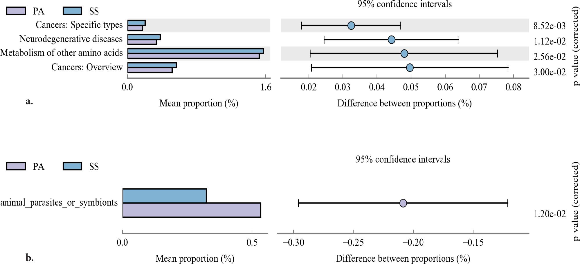 Analysis of the top 30 most abundant KEGG pathways (level 2) revealed limited functional divergence between the two plant species. Microbial functional profiles were largely characterized by conserved core metabolism, with only three pathways showing statistically significant differences (FDR-corrected p < 0.05), all of which were enriched in common seepweed (SS). Two additional pathways approached significance, though all differentially abundant categories exhibited modest effect sizes. At a finer functional resolution (level 3), none of the top 30 KEGG pathways differed significantly between groups. Similarly, FAPROTAX profiling of the top 30 ecological functions identified only one significant group difference: the relative abundance of animal_ parasites_or_symbionts was higher in common reed (PA; 0.53%) than in common seepweed (SS; 0.32%; corrected p = 0.012). No other functions have achieved statistical significance.