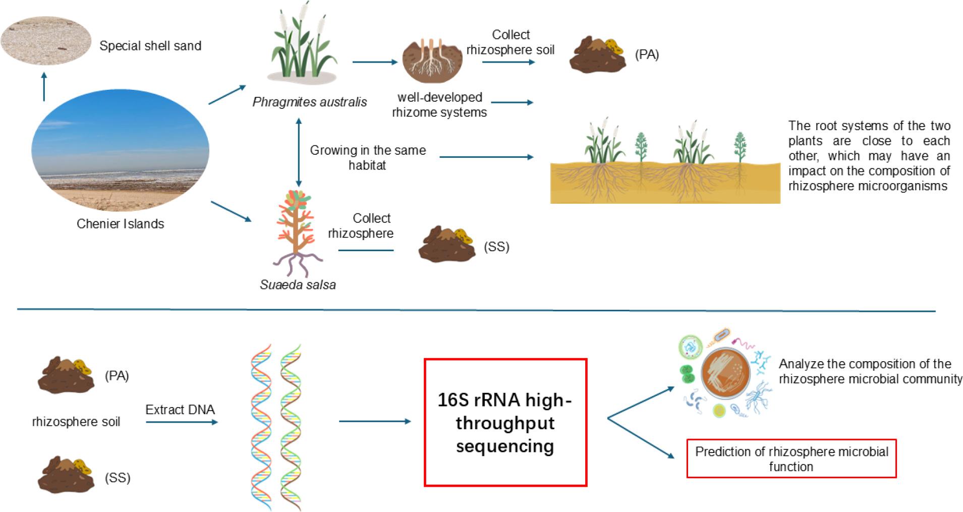 The rhizosphere, the narrow region of soil influenced by plant root activity, is a complex and dynamic microecological environment. This zone offers diverse ecological niches that support a wide range of bacterial communities, which play crucial roles in plant growth, nutrient absorption, and stress tolerance (Chapman et al. 2010). The rhizosphere soil environment is central to the interactions between plants and rhizosphere-inhabiting Bacteria. Within this zone, the functioning and regulation of all biological processes are primarily determined by the dynamic interplay between plant roots and associated Bacteria populations (Solomon et al. 2024). Among the microorganisms interacting with plants, bacteria and fungi have the highest proportions, and they play essential roles in promoting plant growth, nutrient uptake, and enhancing plant stress resistance (Trivedi et al. 2020) Autotrophic nitrogen-fixing bacteria promote plant growth by accelerating phosphorus cycling in the soil and the release of heavy metal ions through processes such as nitrogen fixation, phosphate solubilization, production of siderophores, secretion of IAA (indole-3-acetic acid), and organic acids (Huang et al. 2024; Kraepiel 2009) However, not all microorganisms benefit plants; some pathogenic bacteria can cause diseases and inhibit or impair plant growth. Phytopathogens, including Ralstonia pseudosolanacearum, Fusarium oxysporum, Rhizoctonia solani, and viruses such as wheat yellow mosaic virus (WYMV), can infect root, stem, and foliar tissues, causing significant plant damage (Chen et al. 2025). The proliferation of these pathogens disrupts mutualistic plant-microbe interactions, ultimately impairing ecosystem functioning (Singh et al. 2025). Plant rhizospheres harbor abundant bacterial communities inhabiting root surfaces and the surrounding soil microenvironments. Plant species identity, rhizosphere effects, sloughed root tissues, root exudates, and diverse environmental factors collectively shape the composition of these rhizosphere microbiomes (Yetgin 2023; Pantigoso et al. 2022). Employing high-throughput sequencing techniques to characterize rhizosphere soil bacterial community composition and functionality enables the elucidation and harnessing of plant-microbe interactions to promote plant growth, sustain biodiversity, and achieve species coexistence (Yuan et al. 2022). Field investigations revealed that common reed is widely distributed across the Chenier Islands, with well-developed rhizomes interweaving into an underground network. The root network of common reed is near the root systems of common seepweed. Common reed is a perennial herbaceous plant that propagates continuously via underground rhizomes, forming stable, year-to-year persistent communities that provide a long-term, continuous rhizosphere habitat for microorganisms (Čížková and Lukavská 1999; Chen et al. 2025). In contrast, common seepweed is an annual true halophyte that completes its entire life cycle from seed germination to senescence within a single growing season (Song and Wang 2015). Furthermore, their salt tolerance strategies differ fundamentally: common reed adapts to saline environments primarily through salt avoidance and secretion mechanisms (Guan et al. 2017), whereas common seepweed evolves succulent organs for salt inclusion (Song et al. 2022). Providing an opportunity to investigate the composition, characteristics, and functions of the rhizosphere bacterial communities of common reed and seepweed and their interactions. Rhizosphere bacteria regulate plant growth through their secretions, serving as signaling molecules. Plants and their rhizosphere microbiota collectively form a holobiont, whose extended genome significantly enhances the host’s phenotypic plasticity and ecological adaptability under saline stress. (Olanrewaju et al. 2019; Vandenkoornhuyse et al. 2015). Although the rhizosphere microbiota of coastal saline systems has been widely explored, it remains unclear how P. australis and S. salsa, with their interlaced root systems, achieve niche separation and adaptation to the saline environment in the special soil matrix of the Chenier Islands through differentiated rhizosphere microbiota recruitment strategies. This study hypothesized that P. australis and S. salsa employ distinct recruitment strategies for their root-associated microbiota, predicting significant structural differentiation but functional convergence in their rhizosphere microbial communities. By extracting rhizosphere soil DNA and conducting 16S rRNA high-throughput sequencing, we analyzed the composition and predictive functional profiles of the microbial communities associated with both plant species. This approach enabled a systematic comparison of community structure and potential functional roles, aiming to elucidate plant ecological adaptation mechanisms in the unique habitat of Chenier Islands and provide a theoretical foundation for the phytoremediation and management of coastal saline-affected areas.