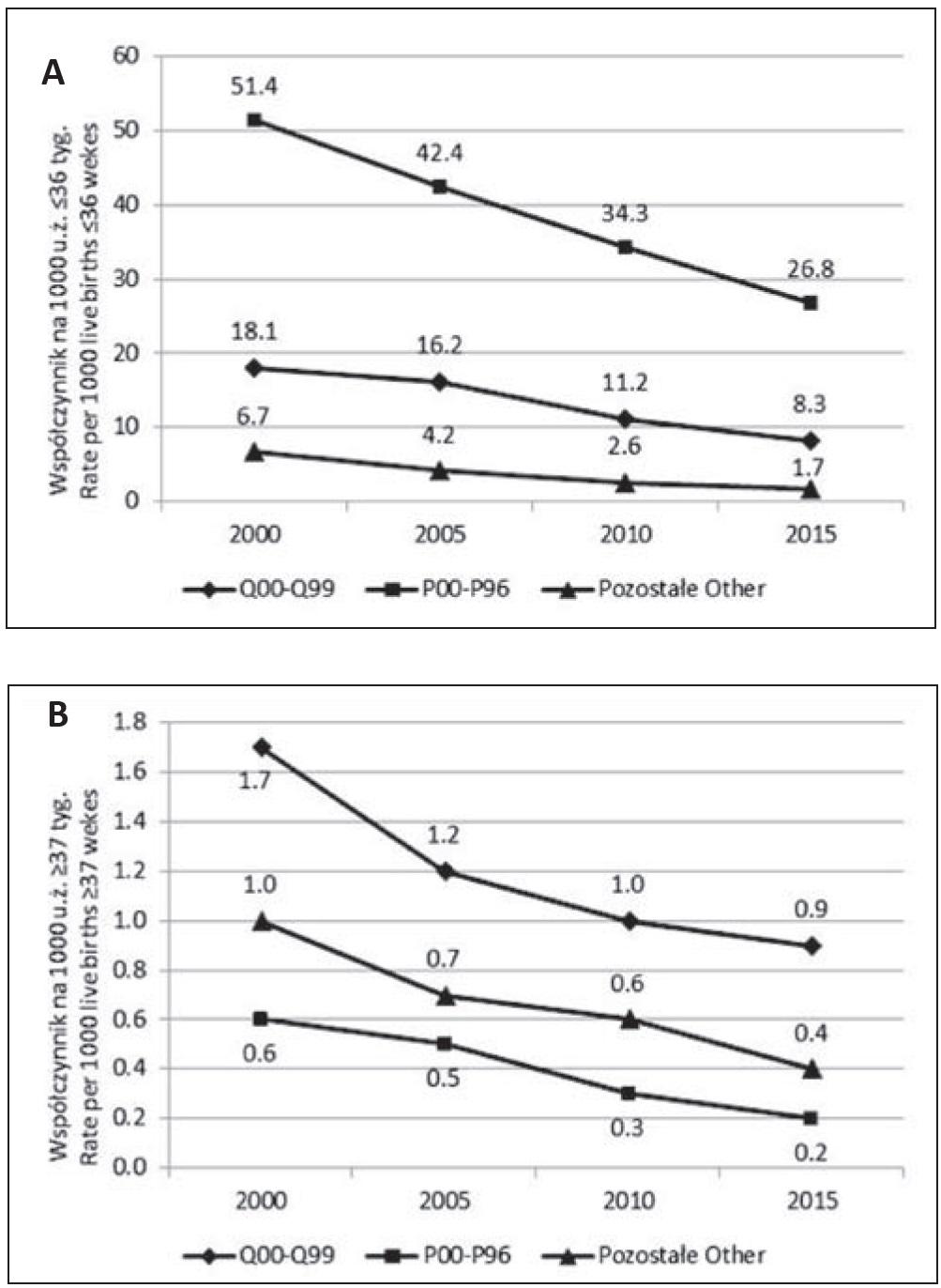 | Rok | Ogółem | Wady wrodzone | Choroby okresu okołoporodowego | Pozostałe | ||||||||