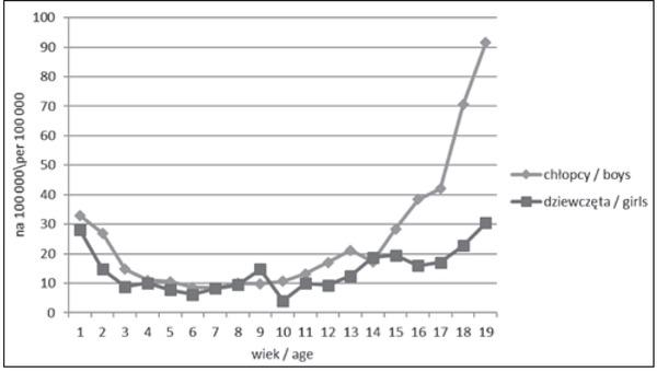 Umieralność dzieci i młodzieży według płci i wieku w 2015 r_ Table I_ Mortality in children and adolescents by age and gender in 2015_