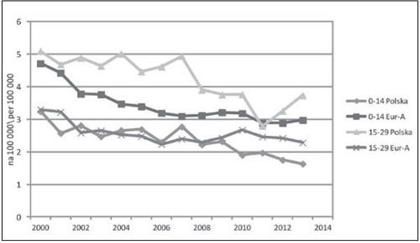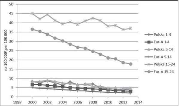 Trendy umieralności dzieci i młodzieży w wieku 1-19 lat na 100 000 osób, według dwóch głównych kategorii przyczyn_ Table III_ Trends in mortality of children and adolescents aged 1-19 per 100 000 persons by main two categories of causes_