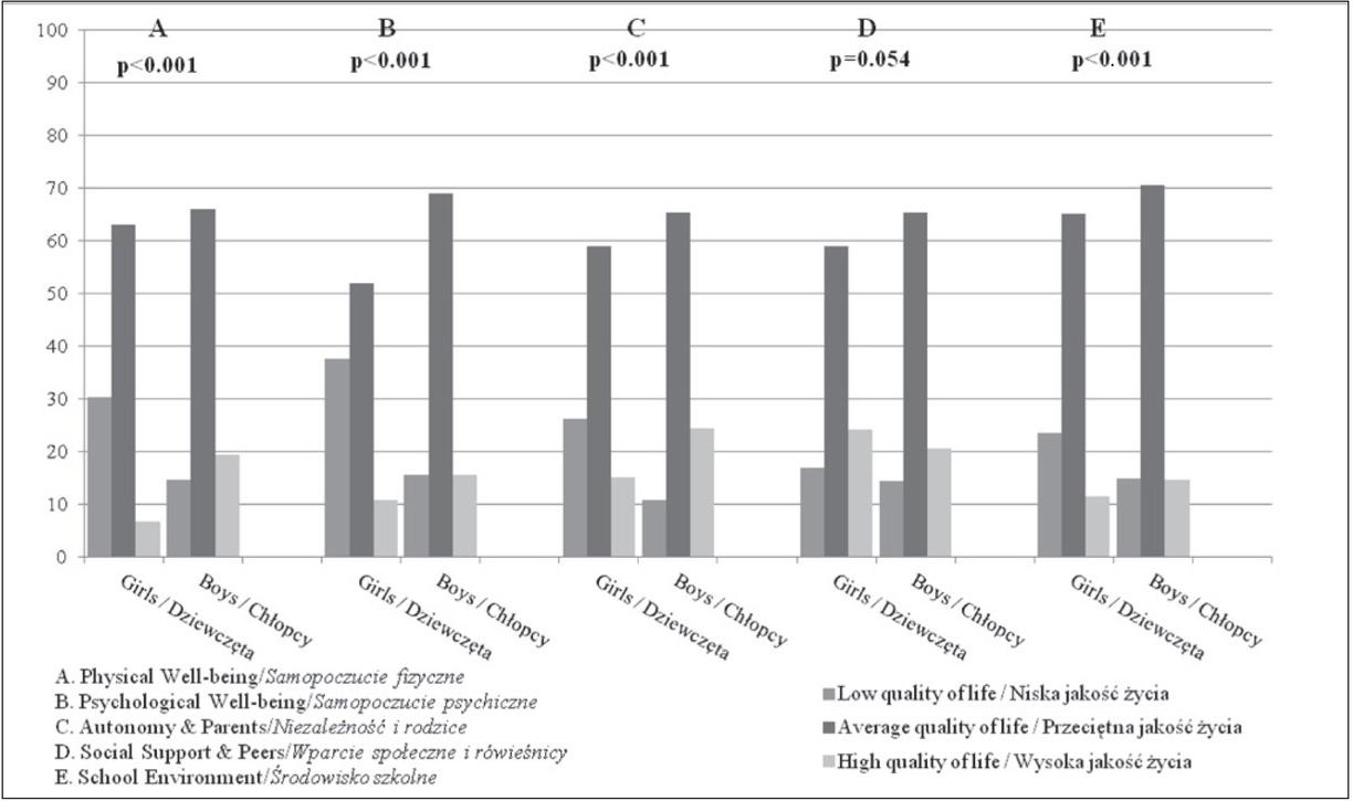 Ryc. 1. Skategoryzowany poziom jakości życia młodzieży krakowskiej wg płci − kryteria zewnętrzne podziału z pracy [7] (A – Samopoczucie fizyczne; B – Samopoczucie psychiczne; C – Niezależność i rodzice; D – Wsparcie społeczne i rówieśnicy; E – Środowisko szkolne).](https://sciendo-parsed.s3.eu-central-1.amazonaws.com/64721c65215d2f6c89dbc591/j_devperiodmed.20172102.124130_fig_001.jpg?X-Amz-Algorithm=AWS4-HMAC-SHA256&X-Amz-Content-Sha256=UNSIGNED-PAYLOAD&X-Amz-Credential=ASIA6AP2G7AKILUUDHGJ%2F20251218%2Feu-central-1%2Fs3%2Faws4_request&X-Amz-Date=20251218T042432Z&X-Amz-Expires=3600&X-Amz-Security-Token=IQoJb3JpZ2luX2VjEMD%2F%2F%2F%2F%2F%2F%2F%2F%2F%2FwEaDGV1LWNlbnRyYWwtMSJGMEQCID9Mrx8WZgHjLA%2B%2FNceu3uHuHPNNUPLev4%2FvJr4gb%2FvwAiAzUWWKquCf4TI%2FPZaNiaNz4KFBd%2BmD6NmqrPpmk11r%2FSrFBQiJ%2F%2F%2F%2F%2F%2F%2F%2F%2F%2F8BEAIaDDk2MzEzNDI4OTk0MCIM5%2FwgDjXJDqAEpaX%2BKpkFu5t2RM0%2BIimDvEiKIZ7%2FEBdGvZUP9qSiewzW8t9cXjF0a7FkGpvuPbG%2Bj2nRjK71yShuyuN5OfQP9Ei20xRRKCuuTSgh8KnOiHHnmNPY25NBuFakkYhtqK7OPE7L9%2B019zCmIrFFjC7Prgv3u%2FzB8THd4VKTn9xr06ZOq4hqB5jgB%2Br0iujfRTfjBgsXT4Z%2BFWrzL8ue0vWYIe3r3ZZOq0eO%2BlfdSqNItC6z8IDZ%2BVuvHKigjta%2BMxtXZUt6SZy4f6RFTLlIDOriuKbSq8S4SfAG90frtmOlvwi8nsu762DAy8%2FUyBSvD1RpVONcjrCZb5GjzCV%2Fv5Jnvuf5ZADGD9dQuONS3kYdJl%2BJhiF6CNuT2tcznDxz84E4TG9bsEVHmVSnEi7ZqrY3SQsOCHx%2Ft9%2FSalIol6jISUZ7r2YFQsTJKOaL5qskIFER2TJZ%2BSMiQMJBFrycZzIhulcJuvjQCESYNorFXShnyroAb6MSBmPUAhK%2FX%2FX9dvmjPtm5vkgU6ZRBwkUljIzmwufvCZRpV237mCimxtHIScyF8rigr9%2FRv5Vzlu%2FwEQjR9aqRjAoXw%2F2uu7r8jgzq37okfIa3LOaOtUslwgn9VOKrDHHK6NjoUpEDps0uIMKIxfwExGTKBY3y0UB94CRdYKeTHYzSnujNyzDgSwyoyNuG6Hw3kkFcckVmQQ5AHwCNhbFTvjOT7VfG%2BUhRVGhT87Vro1h8yTS2EswT9Y6xbYk%2BjDwi9TbyfFWCBCjxb7G9jD8uw4ouEEI5PoxmixP0KbIXVWZEpuCTacqaPPfCB4Bn6ruzCb2QH%2BWAUXKUujohGDke9Cao2nflhmEP%2FUpQXrWsmpQx1gHMUnyus3Vr7EbbT8%2Fw6moHTx523LRexeIwz5CNygY6sgEt0GMssIQMaFO9itE%2Fq3TDZisIBASfBpQO4f7z9kChjnpEXiDgfVzVPDvni%2BDKX8uZcavSGKt9cENHZMMNzZROeqkPxjARQyDfEVkB%2BaQtPRUelvmEULCEGAhYlTOyu%2BUhVmiKNBHPvYwLPpMFnc9Z0URoC%2BRJRM1LSFlJhxTdZrUQnRsJ2ICuv8Ih5%2BxYSGVu5PWIytsMbo4cJKWtdJE6mWmVew1uJVbThGgqpdKfy32M&X-Amz-Signature=44caea06e86049228f245ddc297ded810ba70867a462153236d7464d26edc798&X-Amz-SignedHeaders=host&x-amz-checksum-mode=ENABLED&x-id=GetObject)