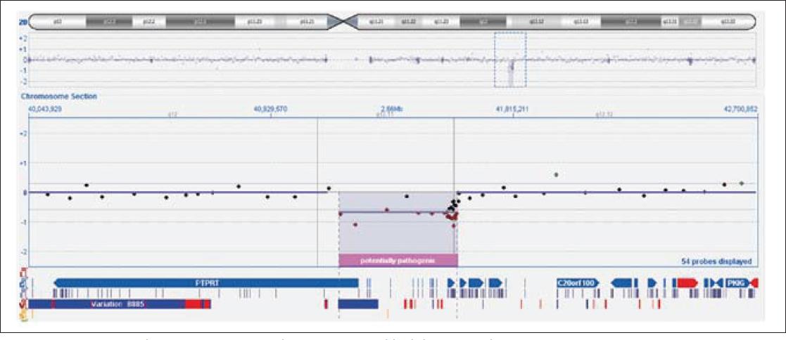 The interstitial deletion of 424 kb was identified at chromosome 20q13.11q13.12 using aCGH (43,117,849-43,541,875 - UCSC Genome Browser on Human Dec 2013 GRCh38/hg38). The deleted region contained three genes: SFRS6 (serine/arginine-rich splicing factor 6, OMIM 601944), L3MBTL (l3mbt, drosophila, homolog of, 1, OMIM 608802) and the first exon of the PTPRT gene (protein tyrosine phosphatase, receptor type, T, OMIM 608712). Both parents were tested by aCGH and were negative for the aberration, indicating that the 20q13.11q13.12 microdeletion occurred de novo in the patient (fig. 1).