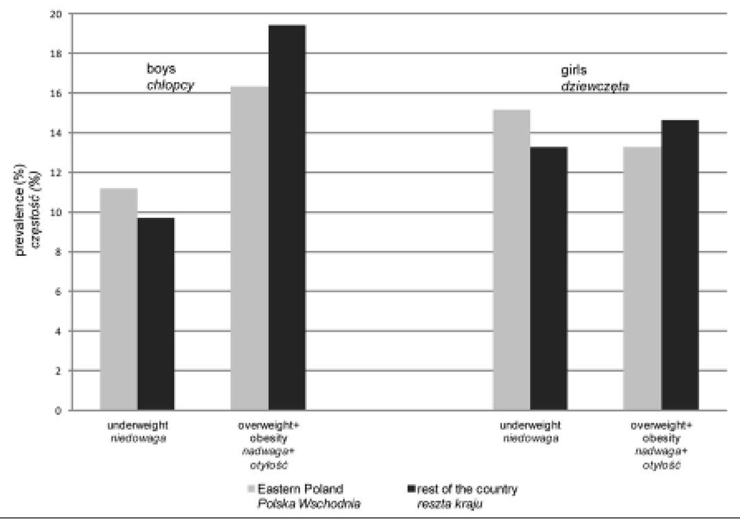 | boys+girls chłopcy +dziewczynki | underweight niedowaga | 13.3 (553) | 11.6 (1548) | 1.17 (1.05-1.30) | 0.003 |