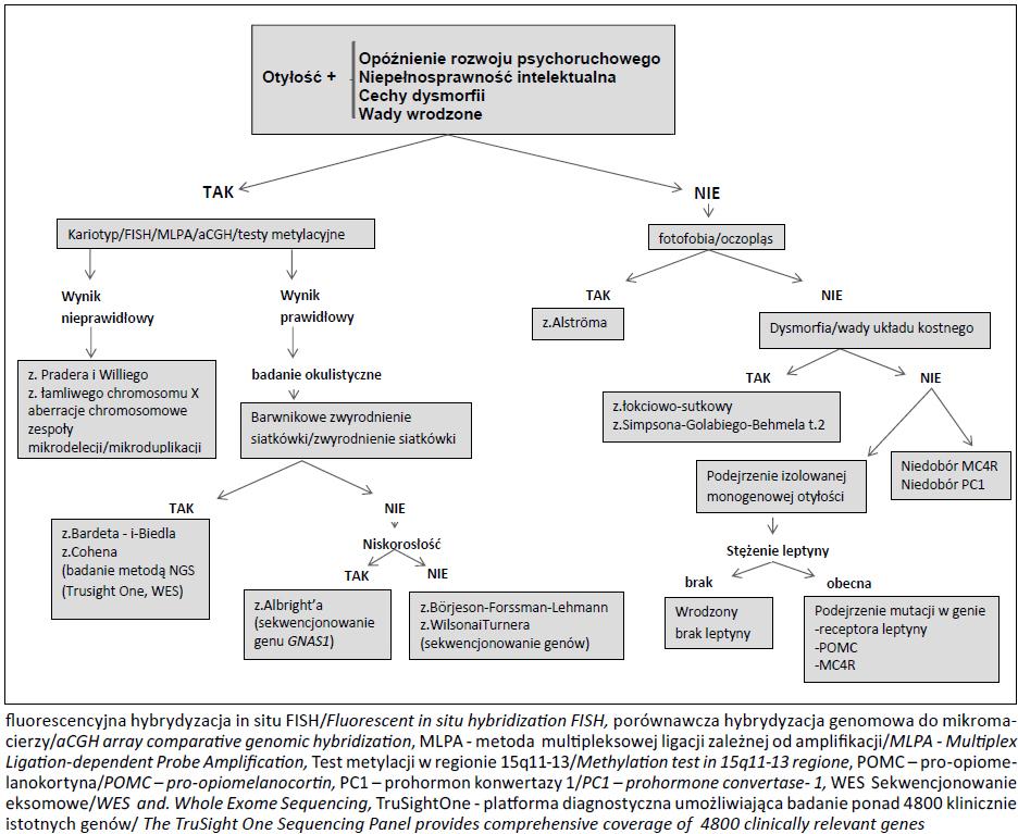 | Zespół Pradera-Willego (OMIM#176270) | 1/20,000 Reinhardt et al. | Zaburzenie rozwoju somatycznego i trudności w karmieniu w wieku niemowlęcym, otyłość i hiperfagia od wczesnego dzieciństwa, obniżone napięcie mięśniowe, hipogonadyzm, niedobór hormonu wzrostu, niski wzrost, małe dłonie 1 stopy, zaburzenia zachowania, niepełnosprawność intelektualna | Tak | Nie | Różne defekty genetyczne | Zaburzenia imprintingu MKRN3/ZNF127, MAGEL2, Delecja NDN, Utrata funkcji NPAP1/C15orf2, Utrata funkcji ojcowskiej kopii SNURF-SNRPN |