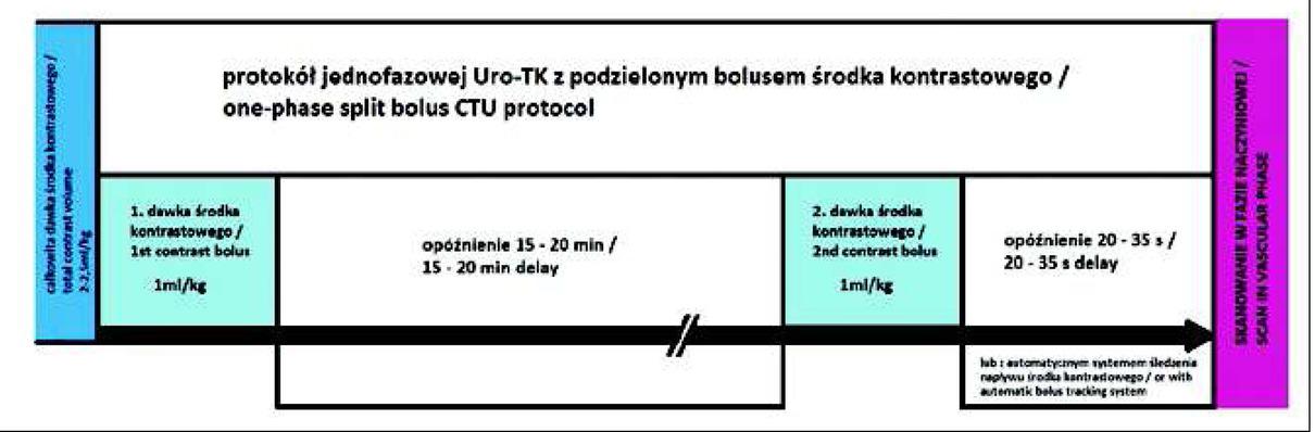 Ryc. 1. Schemat jednofazowej Uro-TK z podzielonym bolusem środka kontrastowego, łączącej fazę naczyniową i wydalniczą. Całkowita dawka środka kontrastowego (2-2,5 ml/kg) została podzielona po połowie dla obu faz. Standardowa przerwa pomiędzy podaniem obu dawek środka kontrastowego wynosi 15-20 min, skanowanie wykonywane jest 20-35 s po podaniu drugiej dawki (w fazie naczyniowej). Automatyczny system śledzenia napływu środka kontrastowego może zostać wykorzystany do przeprowadzenia badania.