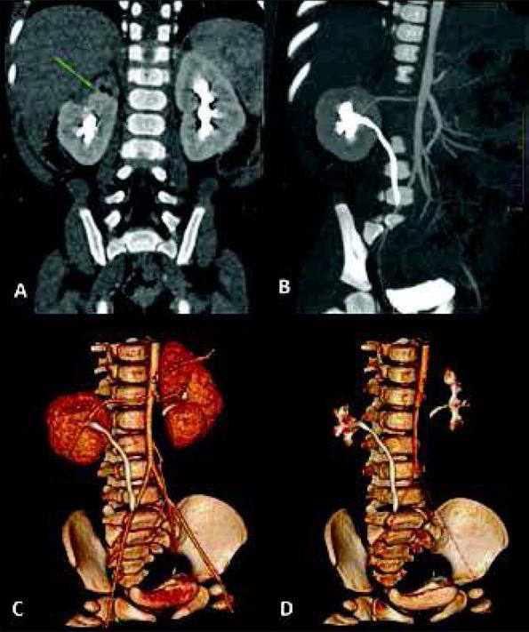 One-phase split-bolus CTU performed before planned surgical intervention in an 8-month-old girl with dys-plastic upper pole of duplicated right kidney. Coronal and volume reconstructions (A-D) show renal anatomy with dysplastic parenchyma (green arrow) and anatomy of vessels and lower collecting system.