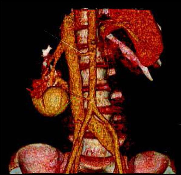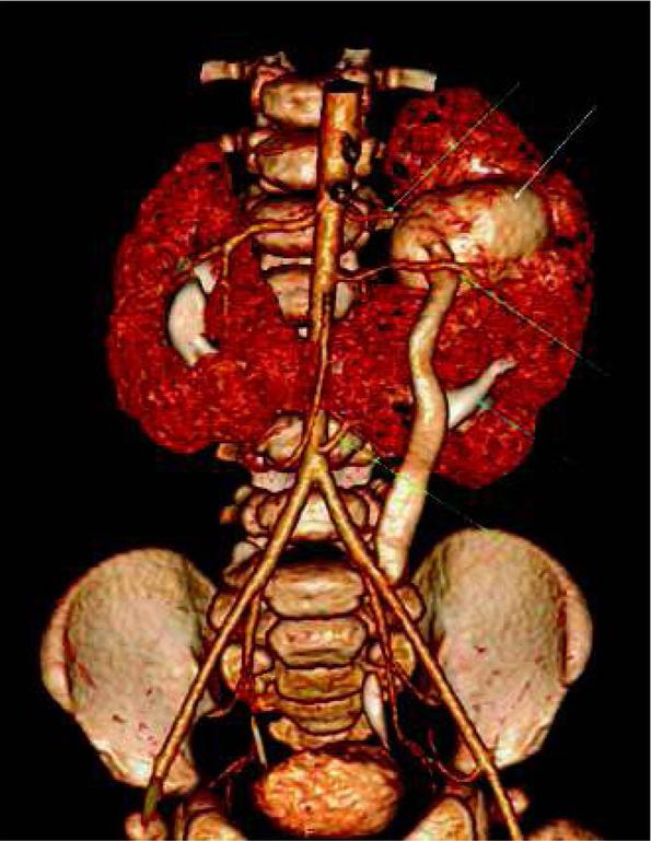 Volume reconstruction of CT performed in a 14-year-old boy with agenesis of the left kidney, after traumatic injury of the right kidney. One-phase split-bolus CT shows two renal arteries (arrows) with amputation of the upper artery (white arrow) and no enhancement of corresponding upper and middle part of the kidney. There were no signs of injury of the collecting system.