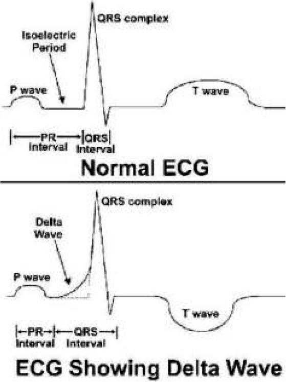 Diagram presenting normal ECG and ECG with characteristic features of preexcitation syndrome [Ventricular pre-excitation: WPW and LGL syndromes. [stan z 12.03.2014] http://www.frca.co.uk/article.aspx?articleid=100691#faq]