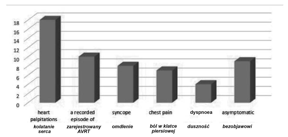 Only 50% of the patients with preexcitation syndromes present clinical symptoms. The most common manifestation are heart palpitations, mostly associated with the occurrence of atrioventricular reentrant tachycardia [1]. In a study on a group of 212 patients with Wolff-Parkinson-White syndrome who experienced heart palpitations, 64% had episodes of atrioventricular reentrant tachycardia [4]. Similar results were obtained in the presented study group, in which the most common reason to seek medical advice were symptoms accompanying supraventricular tachycardia, such as heart palpitations or syncope. On the other hand, during tachyarrhythmia, infants can present nonspecific symptoms, such as irritability, loss of appetite, gastrointestinal or respiratory problems, anxiety or even cardiogenic shock [1]. 33% of the infants in the study group presented unusual symptoms, such as apathy or loss of appetite.