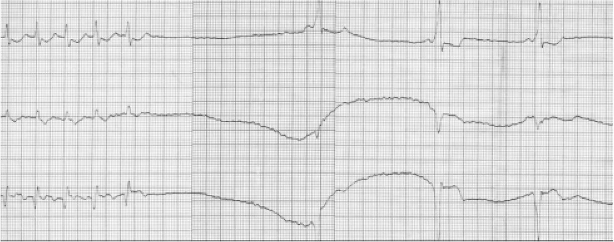 Termination of atrioventricular reentrant tachycardia in response to administration of adenosine. Heart rate = 300 bpm [own material].