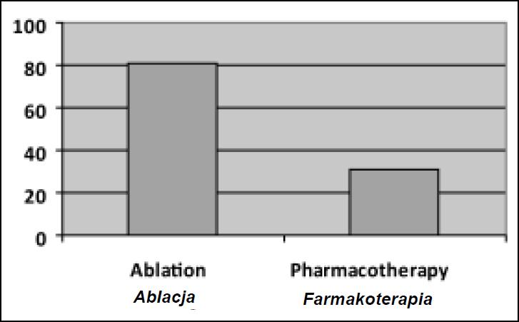 Ablation was a recommended form of treatment for 29 children in the group of patients over the age of five years (80.6%). 20 children (68.9%) underwent ablation, 16 children (80.0%) underwent radiofrequency ablation (RF) and 4 patients (20.0%) underwent cryoablation. 4 children (13.8%) still await ablation. 5 children (17.2%) refrained from this form of therapy due to the lack of parental consent (Figure 7).