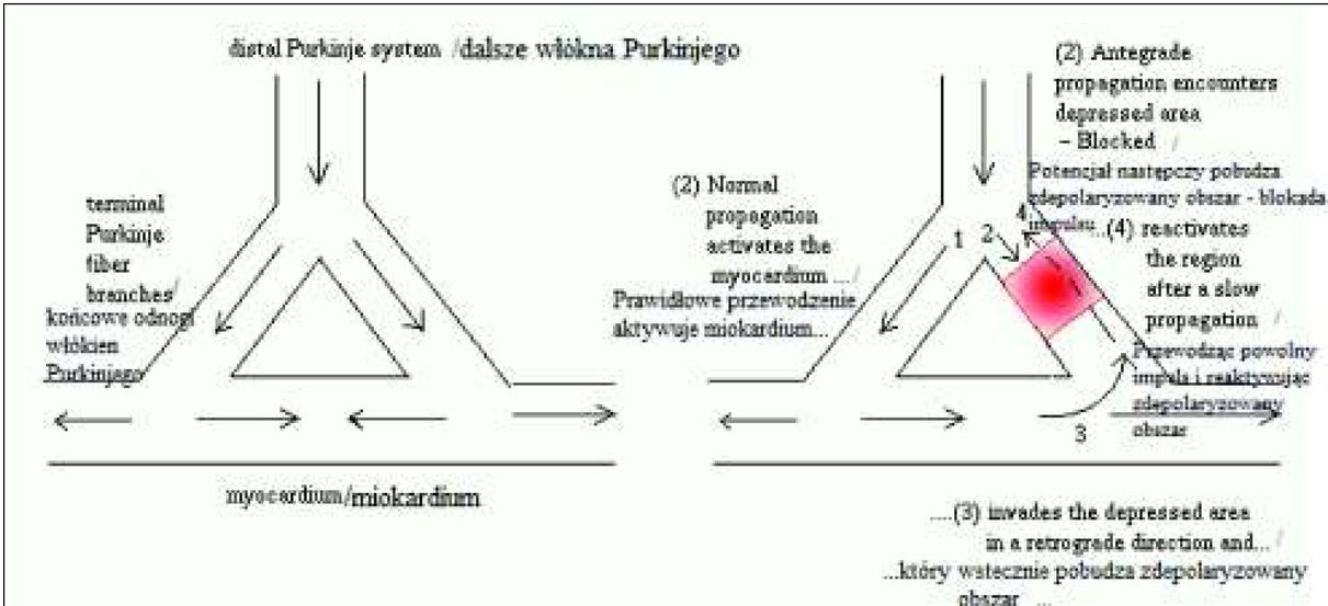 Schemat mechanizmu reentry. Po lewej stronie prawidłowe przewodzenie impulsu w sercu, po prawej stronie zjawisko reentry. [Arnold M. Spatiotemporal dynamics of termination by pacing. A model of reentry [image on the Internet] [stan z 11.02.2014]: http://www.imsc.res.in/~sitabhra/research/heart/pacing/]