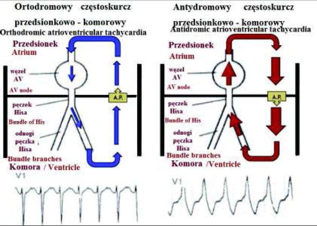 Po lewej stronie częstoskurcz ortodromowy z wąskim zespołem QRS, po prawej stronie częstoskurcz antydromowy z szerokim zespołem QRS. [WPW & AV reciprocating tachycardia. [image on the Internet]. [Cite 2014 Feb 11] http://www.permanente.net/homepage/kaiser/pages/f63698.html]