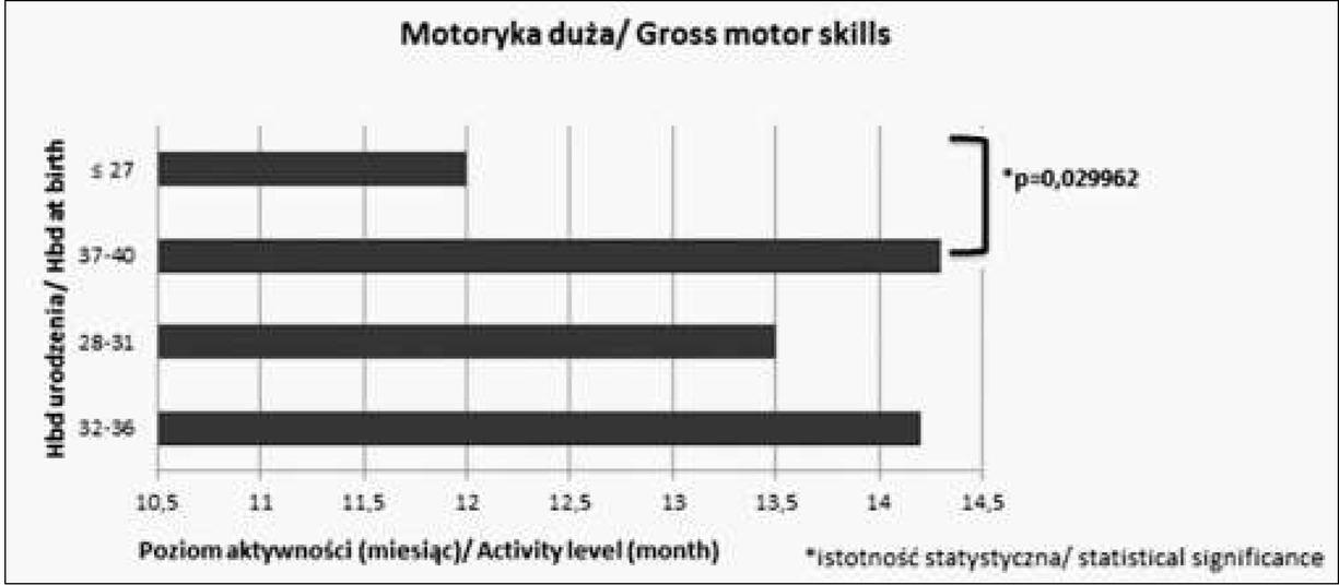 | Motoryka duża Gross motor skills | 13,6 | ± 2,5 miesiąca ± 2,5 month | 14 | ± 2,2 miesiąca ± 2,2 month | 0,105253 |