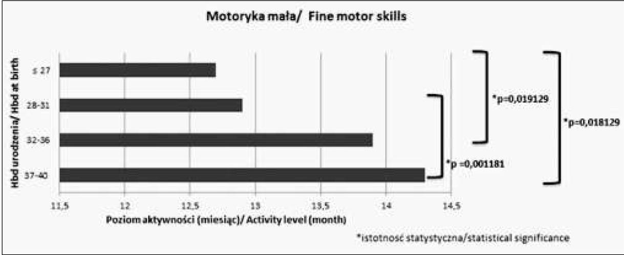 | Motoryka mała Fine motor skills | 13,4 | ± 1,2 miesiąca ± 1,2 month | 14 | ± 0,7 miesiąca ± 0,7 month | |