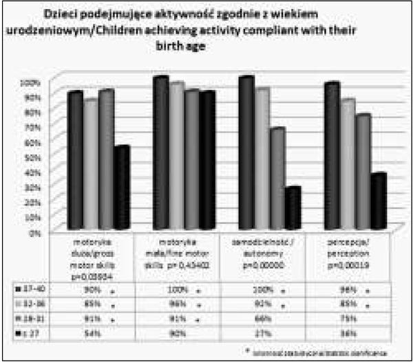 Dzieci uzyskujące w ocenie ogólnej aktywność na poziomie wieku urodzeniowego, z uwzględnieniem poziomu wcześniactwa_Table II_ Children achieving in the general evaluation activity compliant with their birth age, taking into account the level of prematurity_