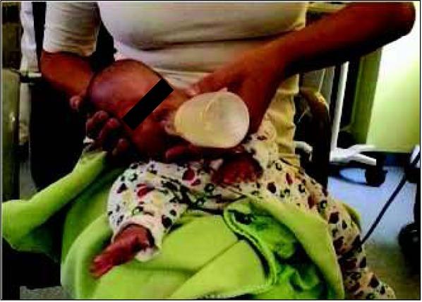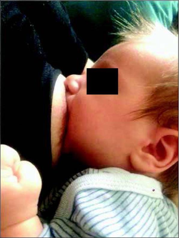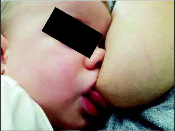 Correct position of the lips at the breast: wide open, tip of the nose and chin touching the breast. Own source.Ryc. 1. Prawidłowa pozycja warg przy piersi: szeroko otwarte, czubek nosa i brody oparty na piersi. Źródło własne.