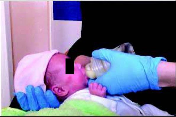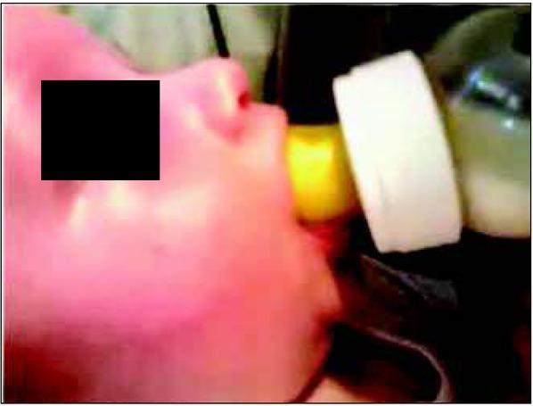 Correct position of the lips during bottle feeding: resting at the edge of the teat. Own source.Ryc. 3. Prawidłowa pozycja warg podczas karmienia butelką: oparte o kołnierz smoczka. Źródło własne.