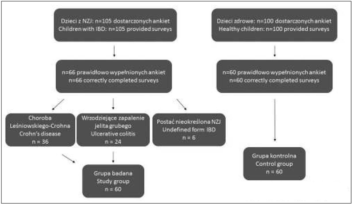 Początkowo badaniem objęto 105 pacjentów z NZJ pozostających pod stałą opieką Kliniki Pediatrii, Alergologii i Gastroenterologii CM SU nr 1 w Bydgoszczy w okresie od 1 stycznia 2015 do 30 czerwca 2016 r. Grupę badaną stanowiło 66 dzieci z NZJ, z czego u 36 (54,55%) rozpoznano ch. L-C., u 24 (36,36%) WZJG, a u 6 (9,09%) NZJ nieokreślone. Z uwagi na niską liczebność grupy dzieci chorujących na postać nieokreśloną NZJ, pacjentów tych pominięto w dalszej analizie. Zatem ostatecznie do badanej grupy zaliczono 60 dzieci. Schemat przebiegu badania zamieszczono na Rycinie 1. NZJ rozpoznawano na podstawie obowiązujących kryteriów klinicznych, endoskopowych, histopatologicznych i radiologicznych zgodnie z zaleceniami ESPGHAN [9]. Wśród metod badawczych zastosowano zwalidowany kwestionariusz ankiety własnej konstrukcji. Grupę kontrolną stanowiło 60 zdrowych dzieci bez NZJ z Poradni Podstawowej Opieki Zdrowotnej w Bydgoszczy. Ankieta składała się z 13 pytań dotyczących wczesnych czynników ryzyka okresu okołoporodowego i niemowlęcego, takich jak: czas trwania i przebieg ciąży, droga porodu, masa urodzeniowa, narażenie na dym tytoniowy czy przebyte infekcje w 1 roku życia.