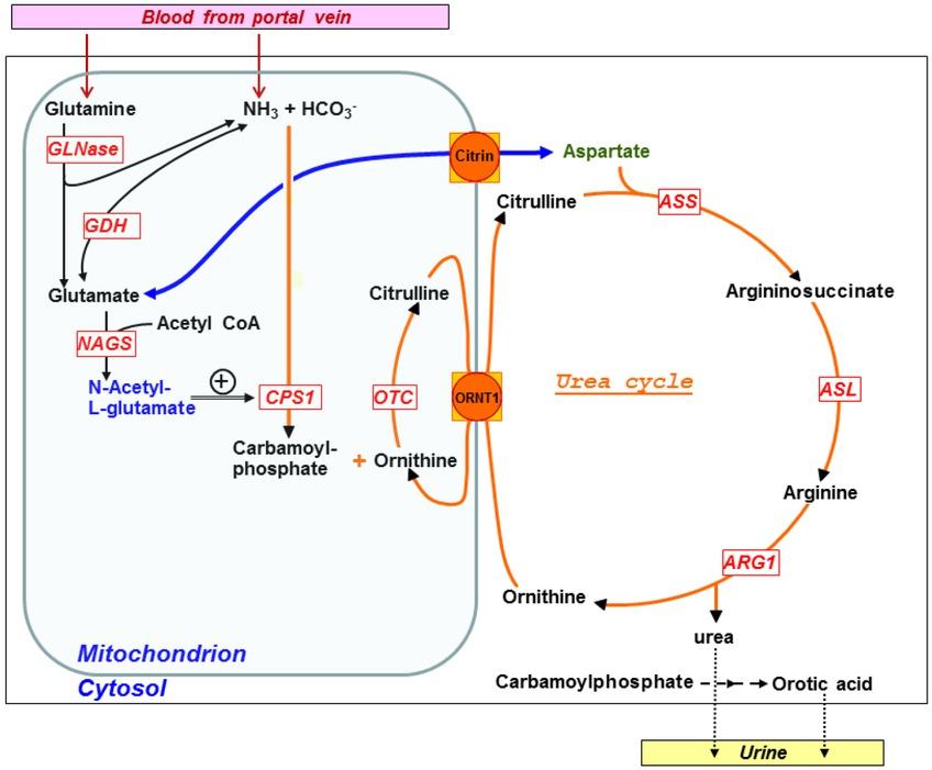 | ASS deficiency | Amino acids in plasma, orotic acid in urine | Glutamine and citrulline in plasma increased, orotic acid in urine increased | Enzymatic block |