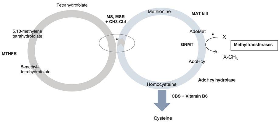low or normal methionine; | MTR 1q43 | 250940 | n | Cbl is expected to be normal (but may be affected by acquired conditions such as decreased su pply). In haptocorrin deficiency, transcobalamin receptor deficiency, MTHFD1 deficiency, and the X-chromosomally inherited HCFC1 defect, tHcy may be but is not consistently elevated. In hypermethioninemias caused by MAT I/III, GNMT, SAHH or ADK deficiencies, tHcy is usually normal or only mildly elevated (usually below 50 μmol/L ) [6, 19, 20]. |