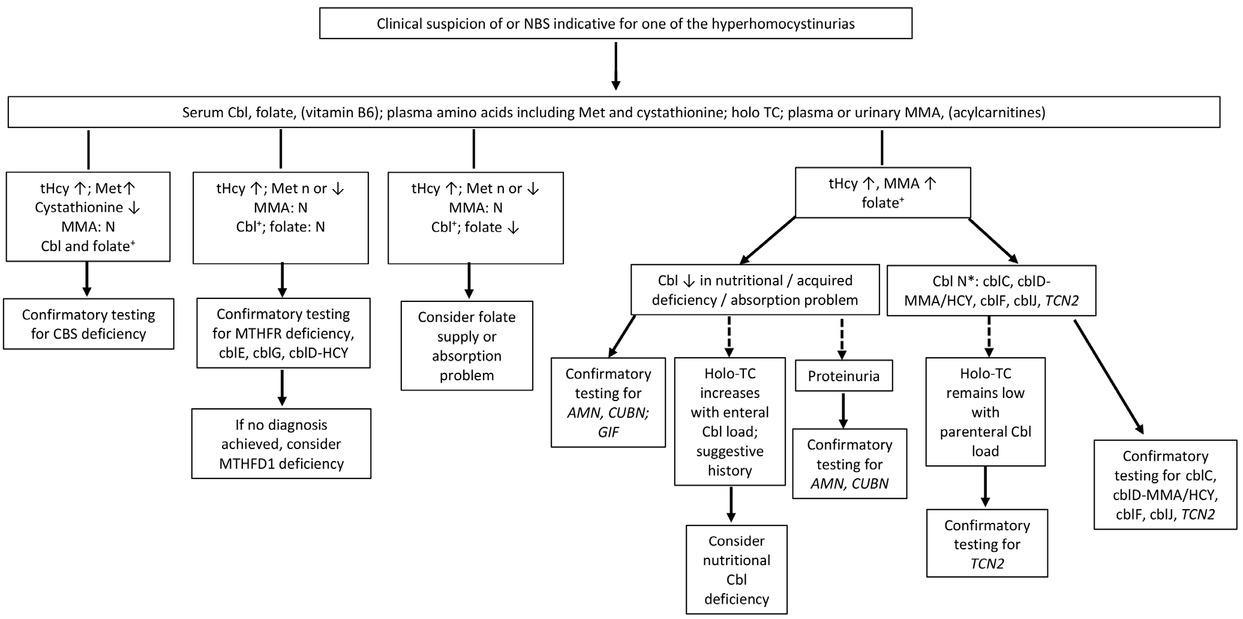 high methionine; | CBS 21q22.3 | 236200 | n | Cbl is expected to be normal (but may be affected by acquired conditions such as decreased su pply). In haptocorrin deficiency, transcobalamin receptor deficiency, MTHFD1 deficiency, and the X-chromosomally inherited HCFC1 defect, tHcy may be but is not consistently elevated. In hypermethioninemias caused by MAT I/III, GNMT, SAHH or ADK deficiencies, tHcy is usually normal or only mildly elevated (usually below 50 μmol/L ) [6, 19, 20]. |