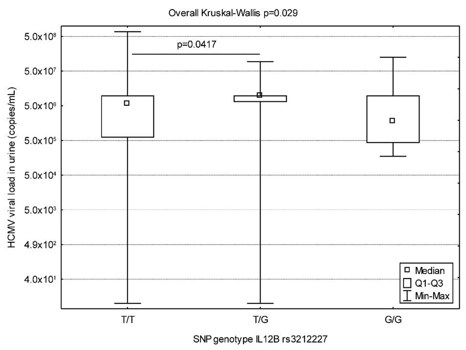 | SNP rs number SNP database (dbSNP) reference number (ID number). | Genotype | n = 73 n (%) | HCMV DNA (copies/mL) in blood | p-value p-value – for comparison between genotypes and viremia. | HCMV DNA (copies/mL) in urine | p-value p-value – for comparison between genotypes and viruria. |