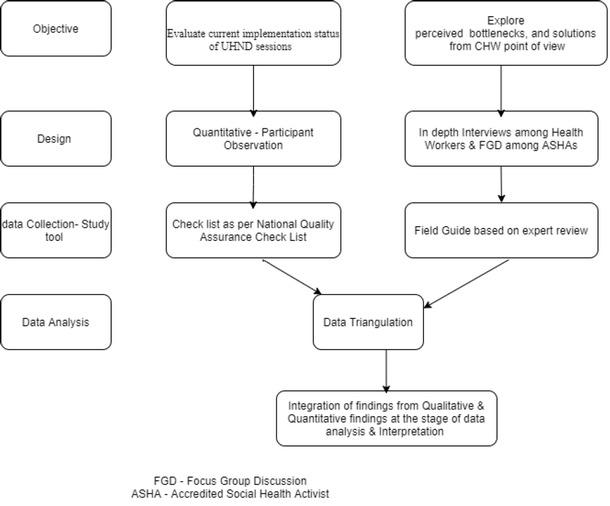 After quantitative assessment, qualitative techniques were used to understand the bottlenecks and barriers in implementing the services. Researchers trained in qualitative methods collected the data. In-depth interviews (IDIs) were carried out among eight purposively selected ASHAs, eight AWWs, four ANMs and one NGO representative, all in the regional language, using a pre-tested, unstructured interview guide as second study tool. An IDI guide included questions related to all the terms of reference. Interviews were continued until data saturation. Field observations and IDIs were followed by focus group discussion (FGDs) among ASHAs. After the briefing on the objectives of the exercise, two free-listing exercises were conducted involving ASHAs on: (1) Activities carried out in their UHND session, and (2) activities expected to be carried out in UHND. After free listing, one FGD was carried out among 11 ASHAs present on that day with the help of a predesigned FGD guide (the third study tool). The domains unearthed in the IDIs were used in the FGD guide. Each TOR was discussed among the group, and for each domain, gaps were identified, possible reasons and ways to address such gaps as perceived by ASHAs were considered. Multiple probes were given in the vernacular language whenever clarification was needed. The entire FGD exercise lasted 90 minutes and was audio recorded; a transcript was prepared on the same day by the person who took notes in the FGD.