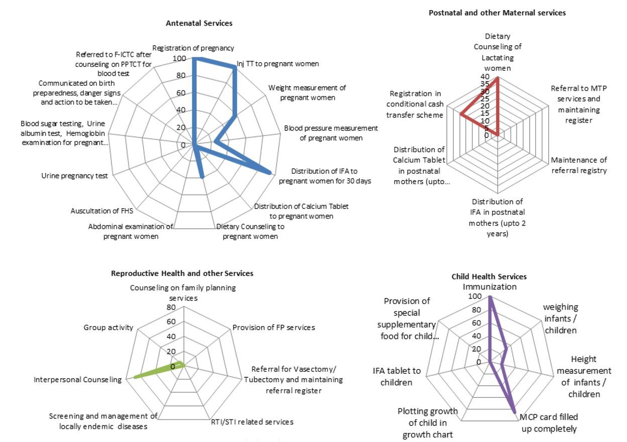 For the qualitative interviews, all ANMs, staff nurses involved in service delivery, were included, and ASHAs were approached based on their expressed willingness to participate in the study. An initial gap assessment was carried out quantitatively using an observation checklist as the first study tool to assess quality of care. The checklist was prepared according to the guidelines proposed by NUHM for conducting UHND [9]. Data were filled by trained epidemiologists for each observed session. Terms of references (TOR) included domains under the implementation of maternal and child health care; curative care for common conditions; screening and continuity of care for NCDs; raising awareness toward preventive and promotive health; provision of family planning services; and access to essential drugs and testing facility. To assess recent regularity and use of services, data on regularity of sessions, number of beneficiaries in each session, due list and follow-up details, availability of logistics and so on were obtained using a structured data extraction form from the last six months of reports prepared by ANMs.