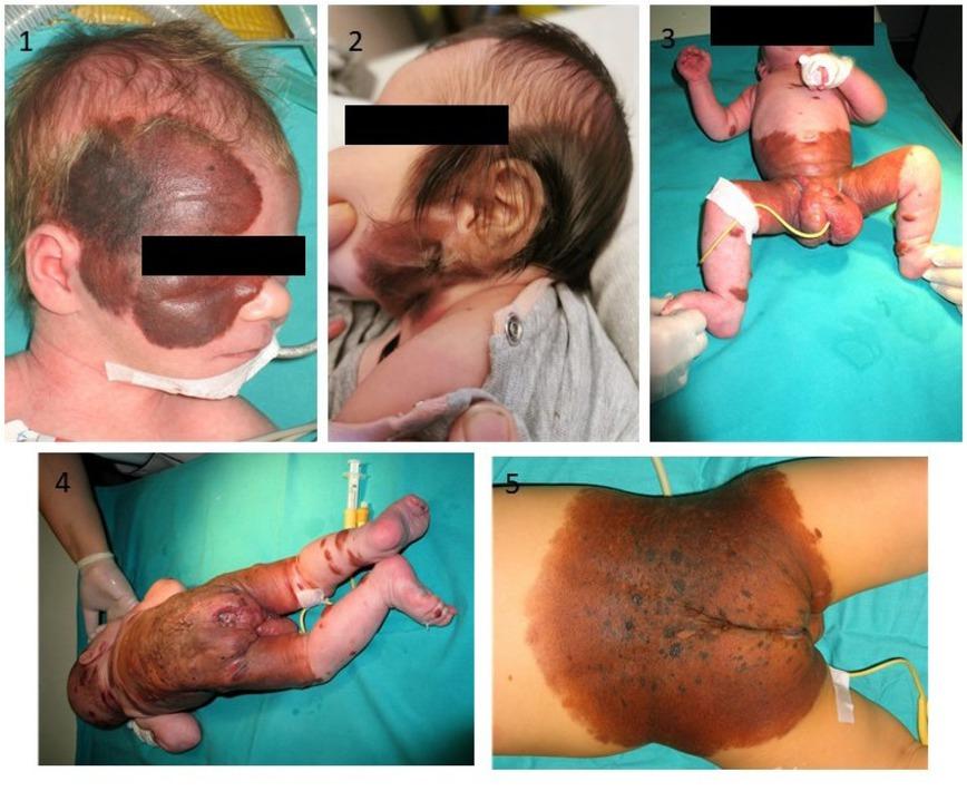 Examples of CMN: head localisation of the nevi (1, 2), anterior and posteriori view of neonate with bathing trunk localisation of the nevus before first operation (3, 4), neonate with back localisation of main nevus (5). Photographed by Marcin R. Szulżycki.