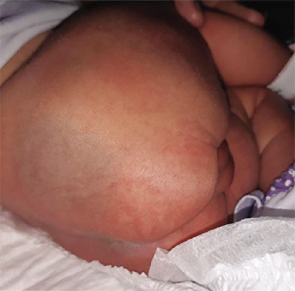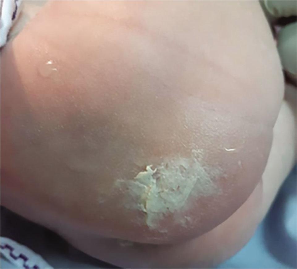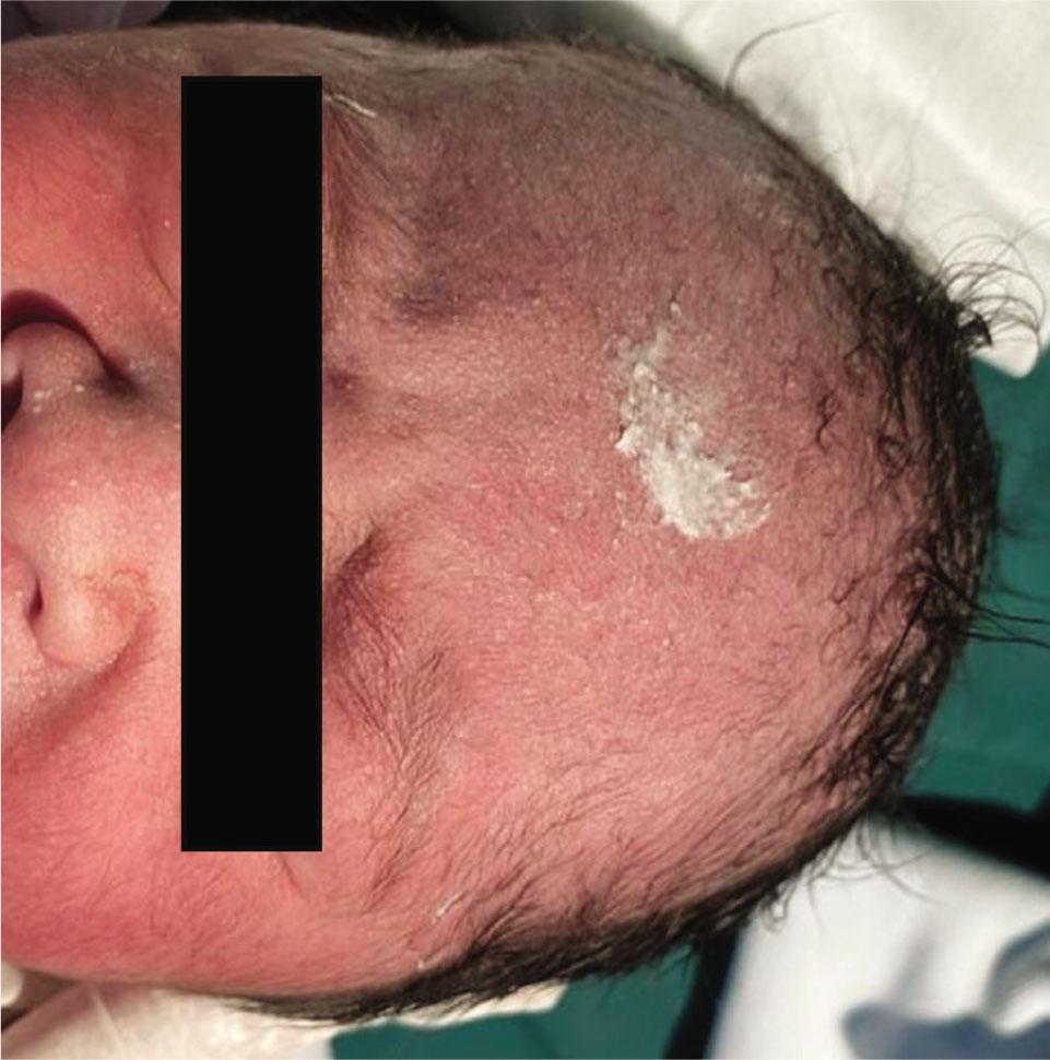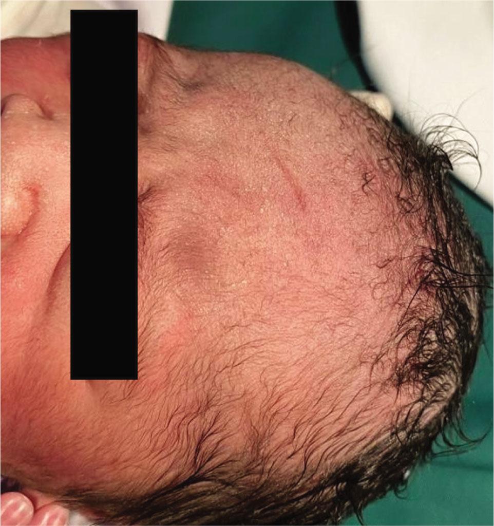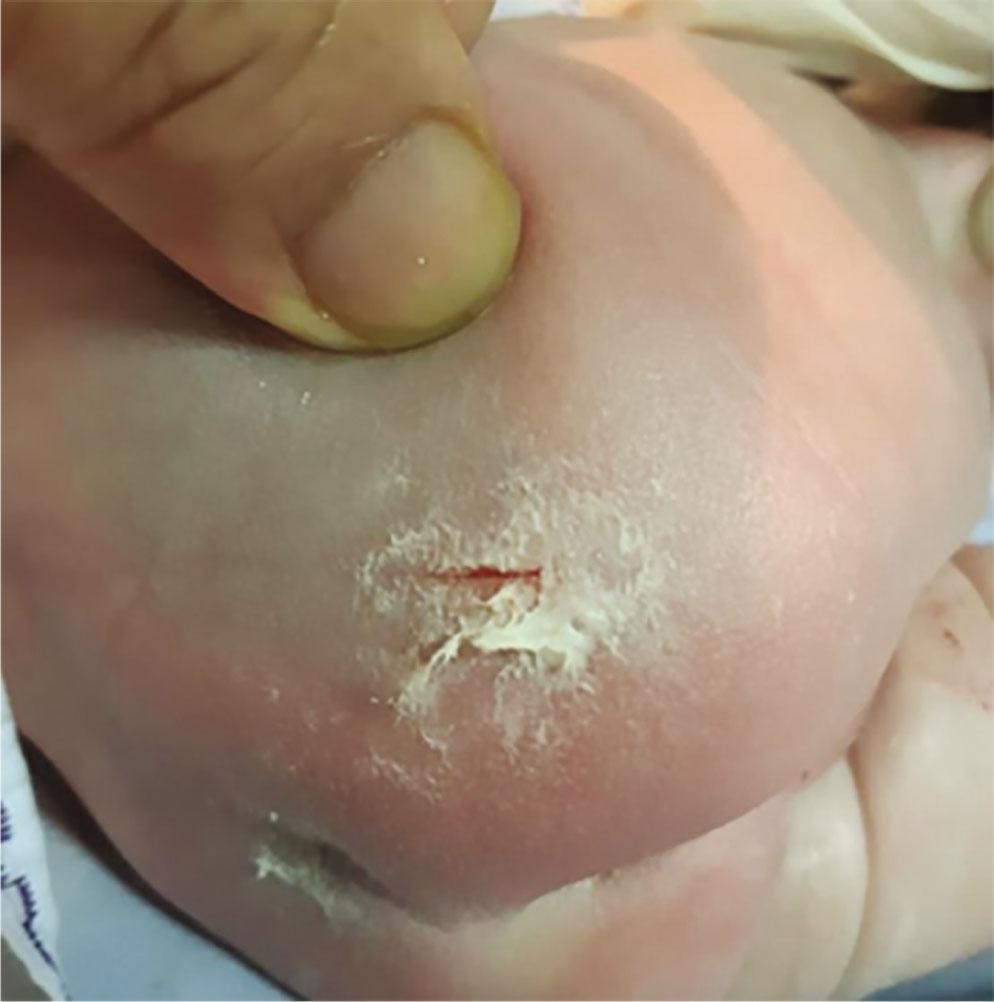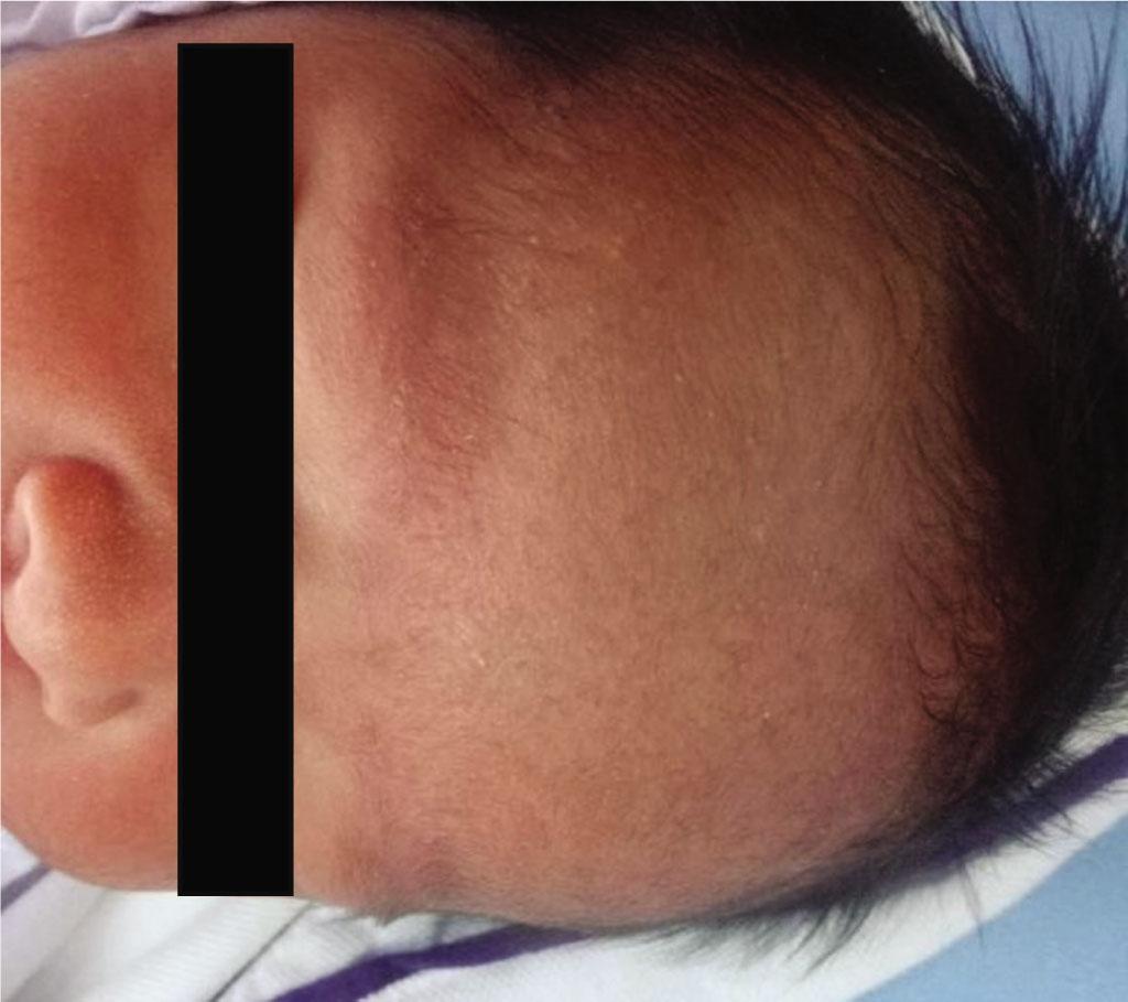 When an incision in the lower uterine segment was made, the scalpel blade directly cut the frontal part of the baby's head, since the baby's head had passed the pelvic inlet at a greatly reduced amniotic fluid amount. As a result, the laceration in length of 3 cm on the baby's frontal region was noted (Figure 1). We decided to heal the laceration with vernix caseosa (VC) taken directly from the baby's body (Figure 2). The treatment with VC was maintained throughout the postpartum hospitalization period, which was 3 days. On Day 3, the VC was removed to evaluate the wound. The laceration turned out to heal without leaving a scar (Figure 3).