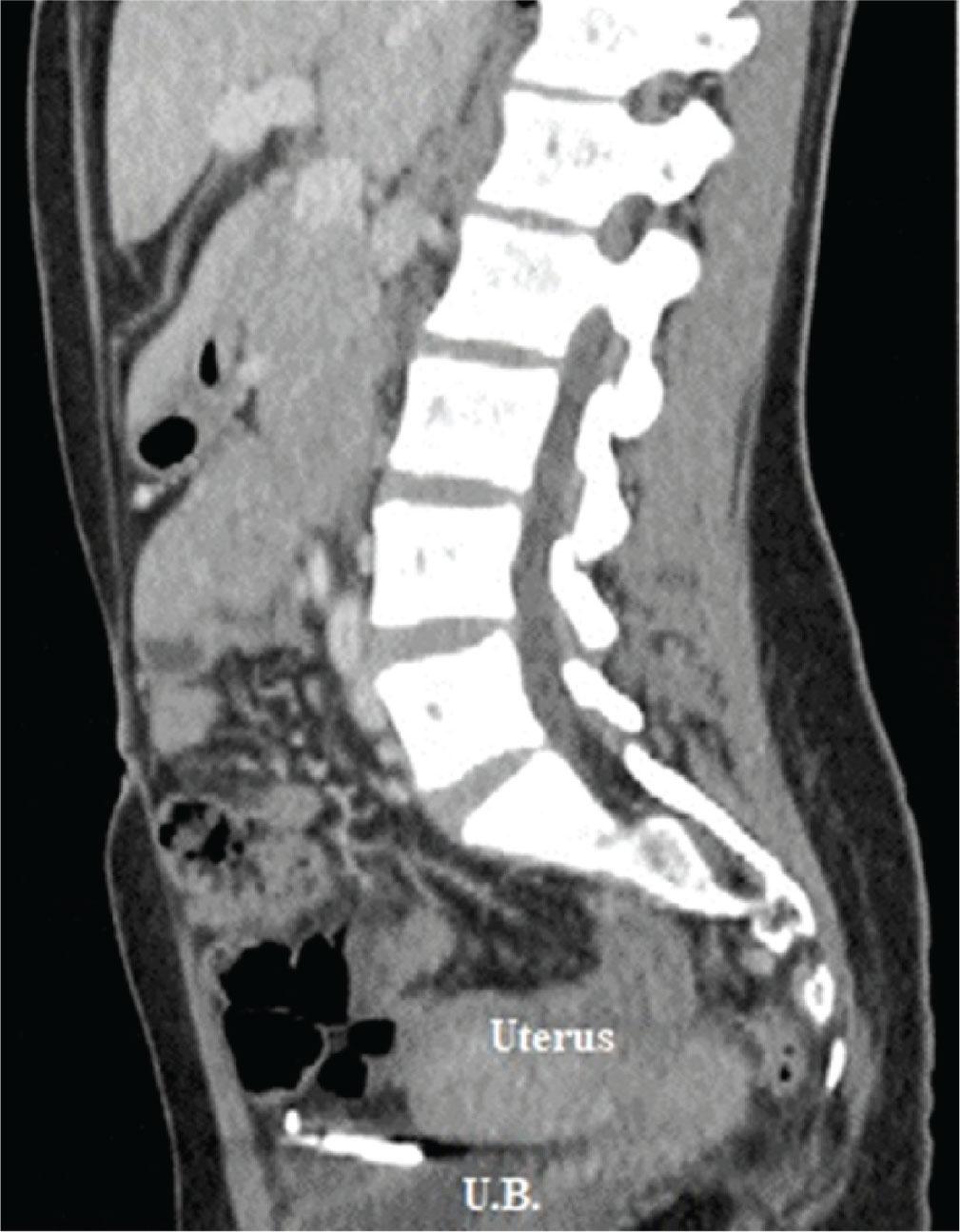 After the exclusion of pregnancy with human chorionic gonadotropin measurement, both a combined abdominal and pelvic X-ray and a departmental transvaginal ultrasound suggested an extrauterine location of the device. Computed tomography with contrast demonstrated the IUD to be located intraperitoneally between the urinary bladder and uterus (Figure 1).
